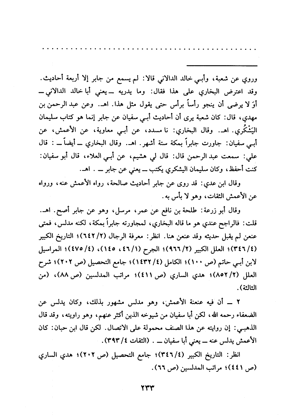 = وروي عن شعبة، وأبي خالد الدالاني قالا: لم يسمع من جابر إلا أربعة أحاديث. وقد اعترض البخاري على هذا فقال: وما يدريه -يعني أبا خالد الدالاني- أوَ لا يرضى أن ينجو رأسًا برأس حتى يقول مثل هذا. اهـ. وعن عبد الرحمن بن مهدي، قال: كان شعبة يرى أن أحاديث أبي سفيان عن جابر إنما هو كتاب سليمان اليَشْكُري. اهـ. وقال البخاري: نا مسدد، عن أبي معاوية، عن الأعمش، عن أبي سفيان: جاورت جابرًا بمكة ستة أشهر. اهـ. وقال البخاري -أيضًا-: قال علي: سمعت عبد الرحمن قال: قال لي هشيم، عن أبي العلاء، قال أبو سفيان: كنت أحفظ، وكان سليمان اليشكري يكتب -يعني عن جابر-. اهـ.