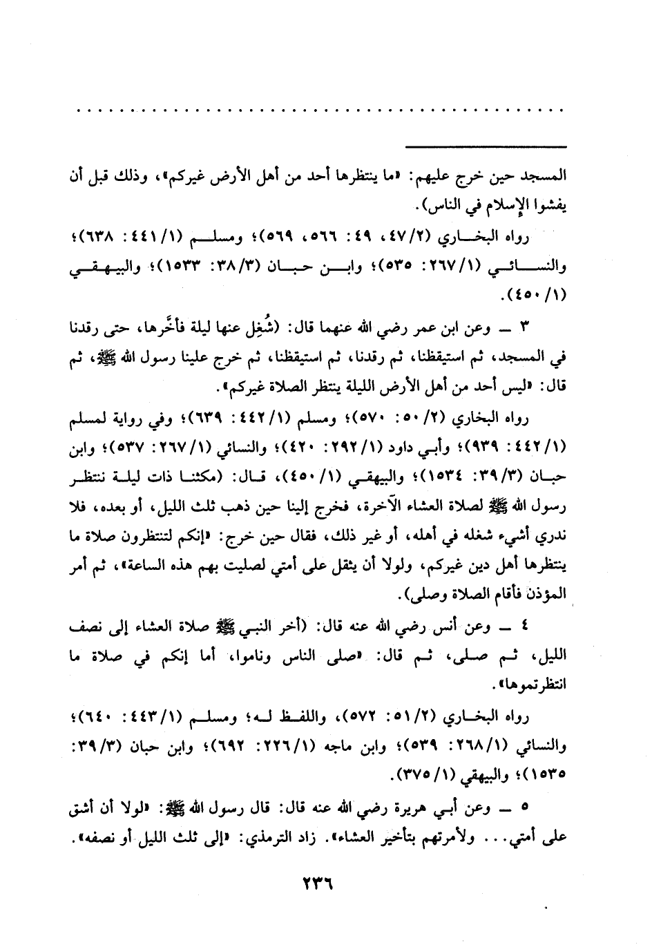 رواه البخاري (2/ 50: 570)؛ ومسلم (1/ 442: 639)؛ وفي رواية لمسلم (1/ 442: 939)؛ وأبي داود (1/ 292: 420)؛ والنسائي (1/ 267: 537)؛ وابن حبان (3/ 39: 1534)؛ والبيهقي (1/ 450)، قال: (مكثنا ذات ليلة ننتظر رسول الله - صلى الله عليه وسلم - لصلاة العشاء الآخرة، فخرج إلينا حين ذهب ثلث الليل، أو بعده، فلا ندري أشيء شغله في أهله، أو غير ذلك، فقال حين خرج: "إنكم لتنتظرون صلاة ما ينتظرها أهل دين غيركم، ولولا أن يثقل على أمتي لصليت بهم هذه الساعة"، ثم أمر المؤذن فأقام الصلاة وصلى).