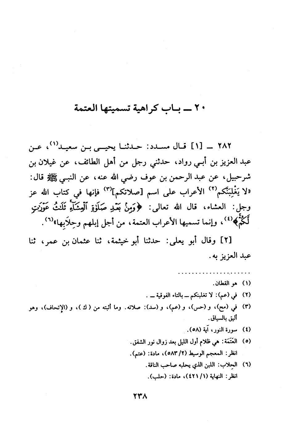 282 -[1] قَالَ مُسَدَّدٌ حَدَّثَنَا يَحْيَى بْنُ سَعِيدٍ عَنْ عَبْدِ الْعَزِيزِ بْنِ أَبِي رَوَّادٍ حَدَّثَنِي رَجُلٌ مِنْ أَهْلِ الطَّائِفِ عَنْ غَيْلَانَ بْنِ شُرَحْبِيلَ عَنْ عَبْدِ الرَّحْمَنِ بْنِ عَوْفٍ رَضِيَ اللَّهُ عَنْهُ عَنِ النَّبِيِّ صَلَّى اللَّهُ عَلَيْهِ وَسَلَّمَ قَالَ " §لَا يَغْلِبَنَّكُمُ الْأَعْرَابُ عَلَى اسْمِ صَلَاتِكُمْ فَإِنَّهَا فِي كِتَابِ اللَّهِ عز وجل الْعِشَاءُ قَالَ اللَّهُ تَعَالَى {وَمِنْ بَعْدِ صَلَاةِ الْعِشَاءِ ثَلَاثُ عورالكم} وَإِنَّمَا بسميها الْأَعْرَابُ الْعَتَمَةَ مِنْ أَجْلِ إِبِلِهِمْ وَحِلَابِهَا "