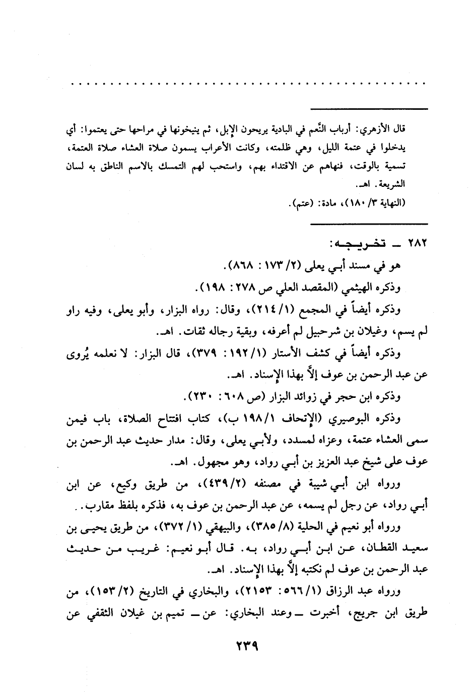 وذكره البوصيري (الإتحاف 1/ 198 ب)، كتاب افتتاح الصلاة، باب فيمن سمى العشاء عتمة، وعزاه لمسدد، ولأبي يعلى، وقال: مدار حديث عبد الرحمن بن عوف على شيخ عبد العزيز بن أبي رواد، وهو مجهول. اهـ.