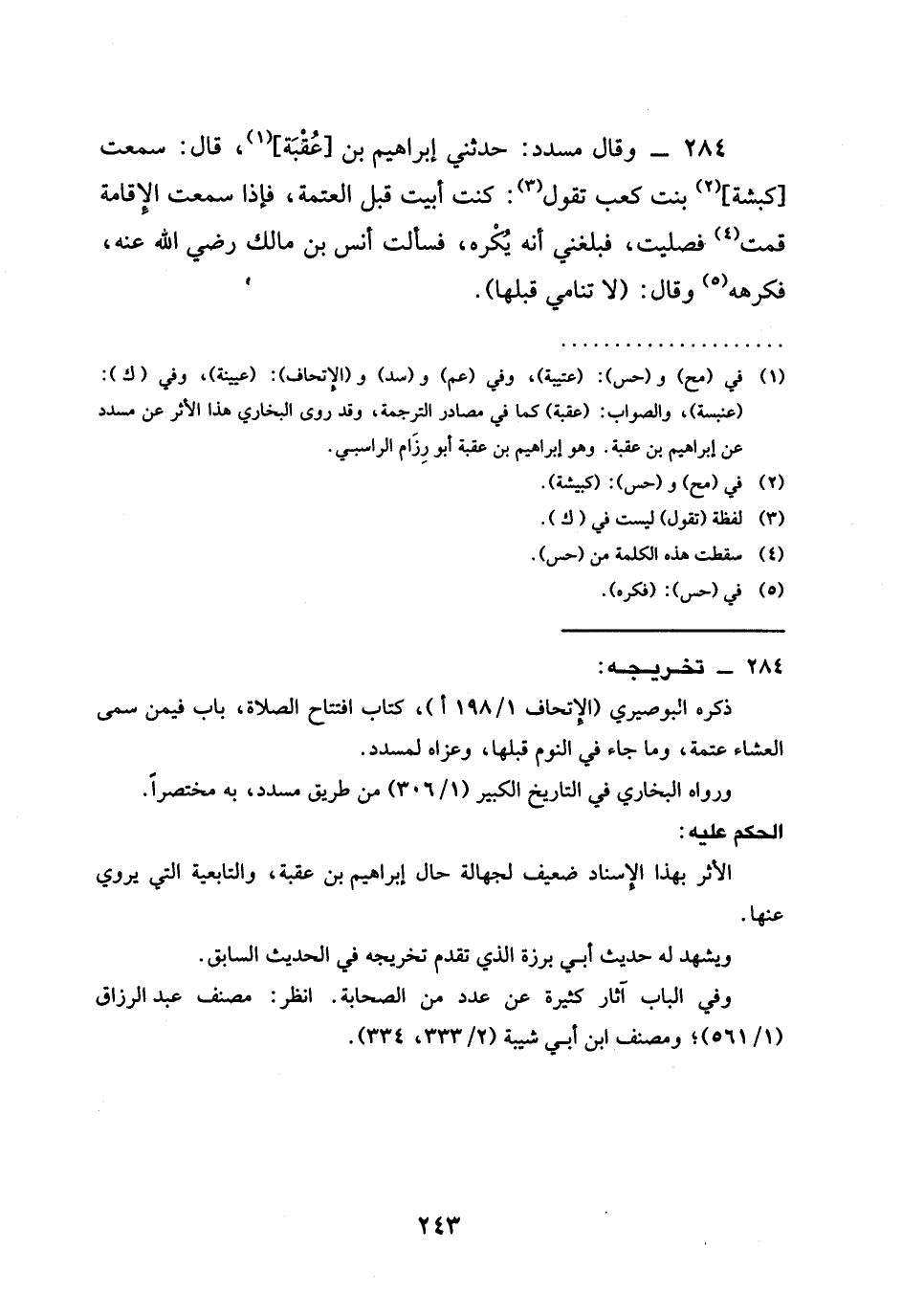 284 - وَقَالَ مُسَدَّدٌ حَدَّثَنِي إِبْرَاهِيمُ بْنُ عُقْبَةَ قَالَ سَمِعْتُ كَبْشَةَ بِنْتَ كَعْبٍ تَقُولُ كُنْتُ §أَبِيتُ قَبْلَ الْعَتَمَةِ فَإِذَا سَمِعْتُ الْإِقَامَةَ قُمْتُ فَصَلَّيْتُ فَبَلَغَنِي أَنَّهُ يُكْرَهُ فَسَأَلْتُ أَنَسَ بْنَ مَالِكٍ رَضِيَ اللَّهُ عَنْهُ فَكَرِهَهُ وَقَالَ (لَا تَنَامِي قَبْلَهَا)
