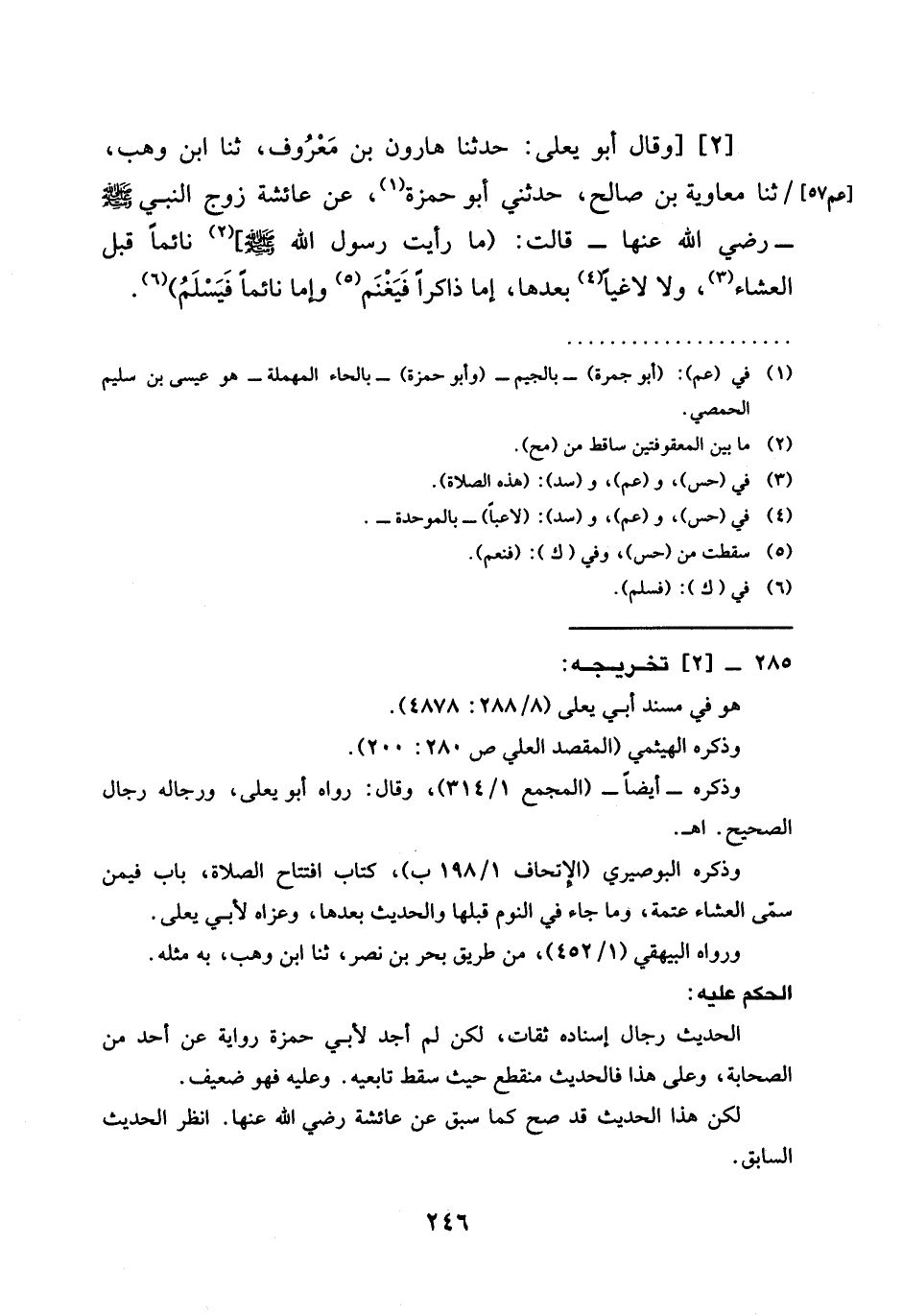 [2] وَقَالَ أَبُو يَعْلَى حَدَّثَنَا هَارُونُ بْنُ مَعْرُوفٍ ثنا ابْنُ وَهْبٍ ثنا مُعَاوِيَةُ بْنُ صَالِحٍ حَدَّثَنِي أَبُو حَمْزَةَ عَنْ عَائِشَةَ زَوْجِ النَّبِيِّ صَلَّى اللَّهُ عَلَيْهِ وَسَلَّمَ رَضِيَ اللَّهُ عَنْها قَالَتْ (§مَا رَأَيْتُ رَسُولَ اللَّهِ صَلَّى اللَّهُ عَلَيْهِ وَسَلَّمَ نَائِمًا قَبْلَ الْعِشَاءِ وَلَا لَاغِيًا بَعْدَهَا إِمَّا ذَاكِرًا فَيَغْنَمُ وَإِمَّا نَائِمًا فَيَسْلَمُ