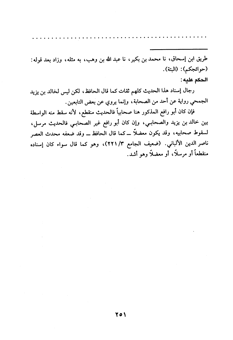 فإن كان أبو رافع المذكور هنا صحابيًا فالحديث منقطع، لأنه سقط منه الواسطة بين خالد بن يزيد والصحابي، وإن كان أبو رافع غير الصحابي فالحديث مرسل، لسقوط صحابيه، وقد يكون معضلًا -كما قال الحافظ- وقد ضعفه محدث العصر ناصر الدين الألباني. (ضعيف الجامع 3/ 221)، وهو كما قال سواء كان إسناده منقطعًا أو مرسلًا، أو معضلًا وهو أشد.