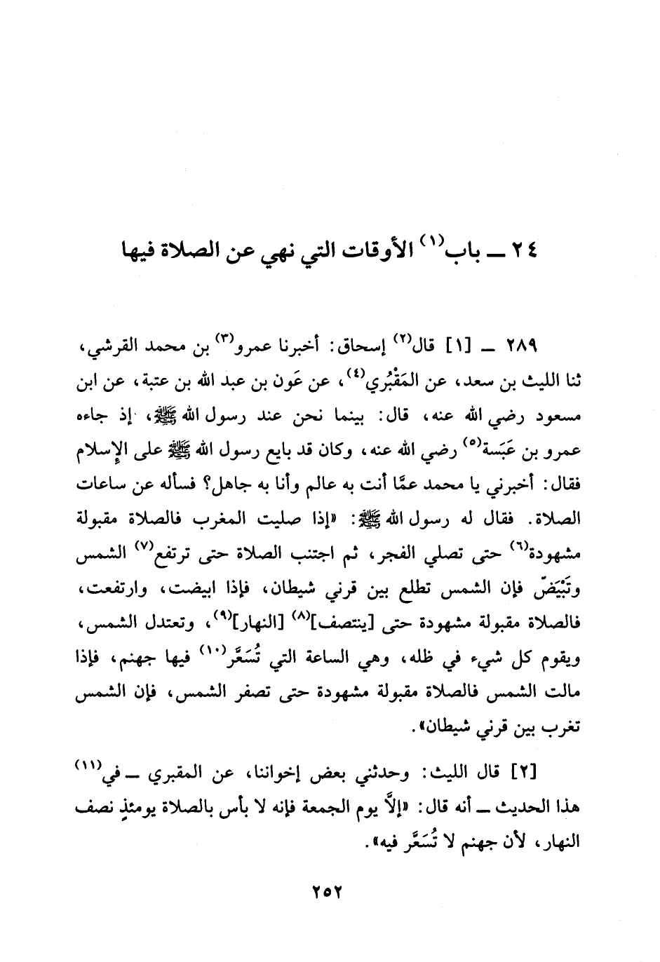 289 -[1] قَالَ إِسْحَاقُ أَخْبَرَنَا عَمْرُو بْنُ مُحَمَّدٍ الْقُرَشِيُّ ثنا اللَّيْثُ بْنُ سَعْدٍ عَنِ الْمَقْبُرِيِّ عَنْ عَوْنِ بْنِ عَبْدِ اللَّهِ بْنِ عُتْبَةَ عَنِ ابن مسعود رضي الله عنه قَالَ بَيْنَمَا نَحْنُ عِنْدَ رَسُولِ اللَّهِ صَلَّى اللَّهُ عَلَيْهِ وَسَلَّمَ إِذْ جَاءَهُ عَمْرُو بن عبسة رضي الله عنه وَكَانَ قَدْ بَايَعَ رَسُولَ اللَّهِ صَلَّى اللَّهُ عَلَيْهِ وَسَلَّمَ عَلَى الْإِسْلَامِ فَقَالَ أَخْبِرْنِي يَا مُحَمَّدُ عَمَّا أَنْتَ بِهِ عَالِمٌ وَأَنَا بِهِ جَاهِلٌ فَسَأَلَهُ عَنْ سَاعَاتِ الصَّلَاةِ فَقَالَ لَهُ رَسُولُ اللَّهِ صَلَّى اللَّهُ عَلَيْهِ وَسَلَّمَ " إِذَا صَلَّيْتَ الْمَغْرِبَ فَالصَّلَاةُ مَقْبُولَةٌ مَشْهُودَةٌ حَتَّى تُصَلِّيَ الْفَجْرَ ثُمَّ §اجْتَنِبِ الصَّلَاةَ حَتَّى تَرْتَفِعَ الشَّمْسُ وَتَبْيَضَّ فَإِنَّ الشَّمْسَ تَطْلُعُ بَيْنَ قَرْنَيْ شَيْطَانٍ فَإِذَا ابْيَضَّتْ وَارْتَفَعَتْ فَالصَّلَاةُ مَقْبُولَةٌ مَشْهُودَةٌ حَتَّى يَنْتَصِفَ النَّهَارُ وَتَعْتَدِلَ الشَّمْسُ وَيَقُومَ كُلُّ شَيْءٍ فِي ظِلِّهِ وَهِيَ السَّاعَةُ الَّتِي تُسَعَّرُ فِيهَا جَهَنَّمُ فَإِذَا مَالَتِ الشَّمْسُ فَالصَّلَاةُ مَقْبُولَةٌ مَشْهُودَةٌ حَتَّى تَصْفَرَّ الشَّمْسُ فَإِنَّ الشَّمْسَ تَغْرُبُ بَيْنَ قَرْنَيِ شيطان "