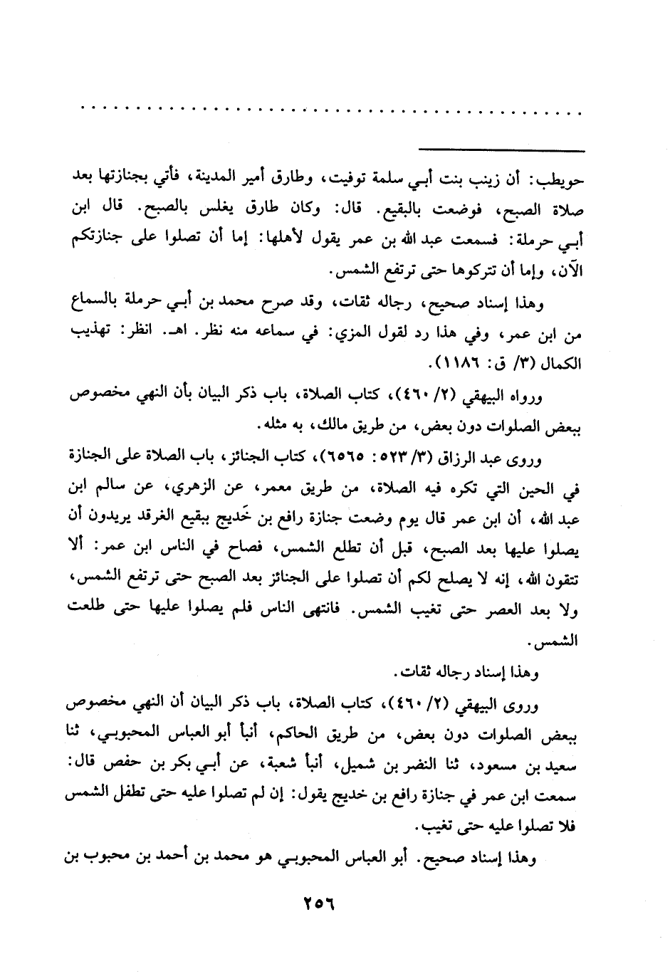 وروى عبد الرزاق (3/ 523: 6565)، كتاب الجنائز، باب الصلاة على الجنازة في الحين التي تكره فيه الصلاة، من طريق معمر، عن الزهري، عن سالم ابن عبد الله، أن ابن عمر قال يوم وضعت جنازة رافع بن خَديج ببقيع الغرقد يريدون أن يصلوا عليها بعد الصبح، قبل أن تطلع الشمس، فصاح في الناس ابن عمر: ألا تتقون الله، إنه لا يصلح لكم أن تصلوا على الجنائز بعد الصبح حتى ترتفع الشمس، ولا بعد العصر حتى تغيب الشمس. فانتهى الناس فلم يصلوا عليها حتى طلعت الشمس.