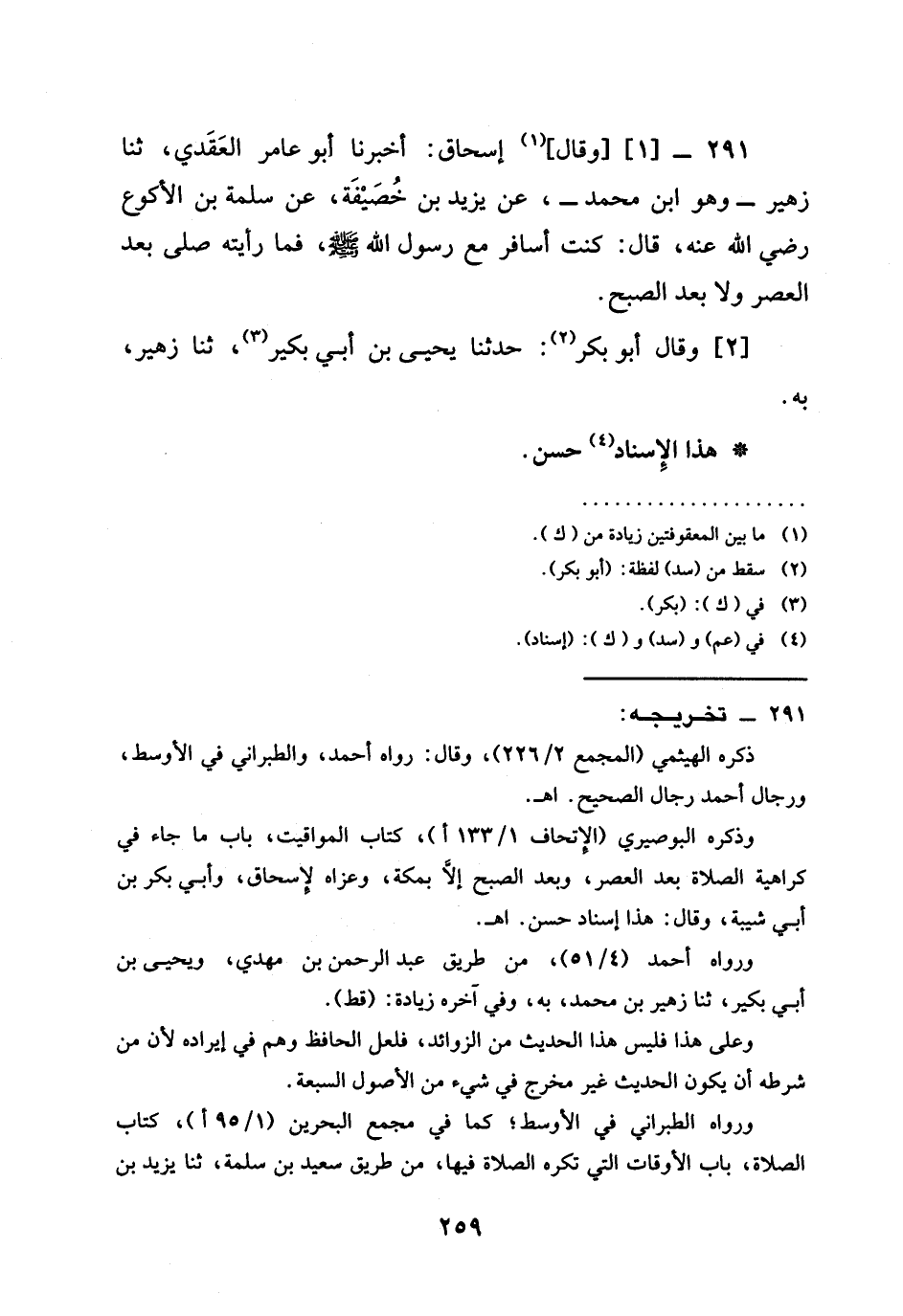 291 -[1] وَقَالَ إِسْحَاقُ أَخْبَرَنَا أَبُو عَامِرٍ الْعَقَدِيُّ ثنا زُهَيْرٌ وَهُوَ ابْنُ مُحَمَّدٍ عَنْ يَزِيدَ بْنِ خُصَيْفَةَ عَنْ سَلَمَةَ بْنِ الْأَكْوَعِ رَضِيَ اللَّهُ عَنْهُ قَالَ كُنْتُ أُسَافِرُ مَعَ رَسُولِ اللَّهِ صَلَّى اللَّهُ عَلَيْهِ وَسَلَّمَ §فَمَا رَأَيْتُهُ صَلَّى بَعْدَ الْعَصْرِ وَلَا بَعْدَ الصُّبْحِ
