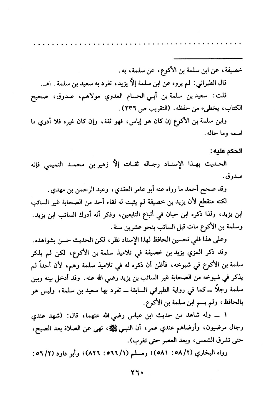 وقد ذكر المزي يزيد بن خصيفة في تلاميذ سلمة بن الأكوع، لكن لم يذكر سلمة بن الأكوع في شيوخه، فاظن أن ذكره له في تلاميذ سلمة وهم، لأن أحدًا لم يذكر في شيوخه من الصحابة غير السائب بن يزيد رضي الله عنه. وقد أدخل بينه وبين سلمة رجلًا -كما في رواية الطبراني السابقة- تفرد بها سعيد بن سلمة، وليس هو بالحافظ، ولم يسم ابن سلمة بن الأكوع.
