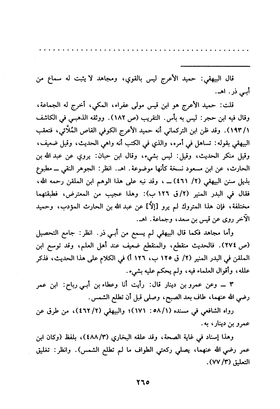 قلت: حميد الأعرج هو ابن قيس مولى عفراء، المكي، أخرج له الجماعة، وقال فيه ابن حجر: ليس به بأس. التقريب (ص 182). ووثقه الذهبي في الكاشف 1/ 193). وقد ظن ابن التركماني أنه حميد الأعرج الكوفي القاص المُلاَّئي، فتعقب البيهقي بقوله: تساهل في أمره، والذي في الكتب أنه واهي الحديث، وقيل ضعيف، وقيل منكر الحديث، وقيل: ليس بشيء، وقال ابن حبان: يروي عَنْ عَبْدِ اللَّهِ بْنِ الْحَارِثِ، عَنِ ابْنِ مسعود نسخة كأنها موضوعة. اهـ. انظر: الجوهر النقي- مطبوع بذيل سنن البيهقي (2/ 461) -، وقد نبه على هذا الوهم ابن الملقن رحمه الله، فقال في البدر المنير (2/ ق 126 ب): وهذا عجيب من المعترض، فطبقتهما مختلفة، فإن هذا المتروك لم يرو [إلَّا]، عن عبد الله بن الحارث المؤدب، وحميد الآخر روى عن قيس بن سعد، وجماعة. اهـ.