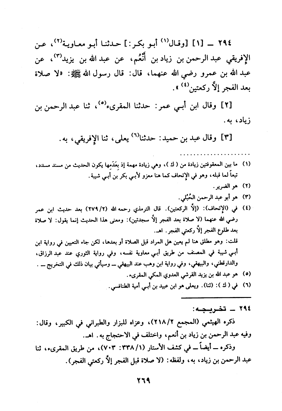 294 -[1] وَقَالَ أَبُو بَكْرٍ حَدَّثَنَا أَبُو مُعَاوِيَةَ عَنِ الْإِفْرِيقِيِّ عَبْدِ الرَّحْمَنِ بْنِ زِيَادِ بْنِ أَنْعَمَ عَنْ عَبْدِ اللَّهِ بْنِ يَزِيدَ عَنْ عَبْدِ اللَّهِ بْنِ عَمْرٍو رَضِيَ اللَّهُ عَنْهما قَالَ قَالَ رَسُولُ اللَّهِ صَلَّى اللَّهُ عَلَيْهِ وَسَلَّمَ §لَا صَلَاةَ بَعْدَ الْفَجْرِ إِلَّا رَكْعَتَيْنِ "