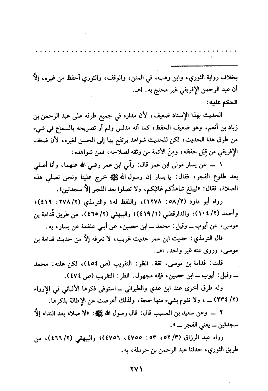 1 - عن يسار مولى ابن عمر قال: رآني ابن عمر رضي الله عنهما، وأنا أصلي بعد طلوع الفجر، فقال: يا يسار إن رسول الله خرج علينا ونحن نصلي هذه الصلاة، فقال: "ليبلغ شاهدُكم غائبَكم، ولا تصلوا بعد الفجر إلَّا سجدتين".