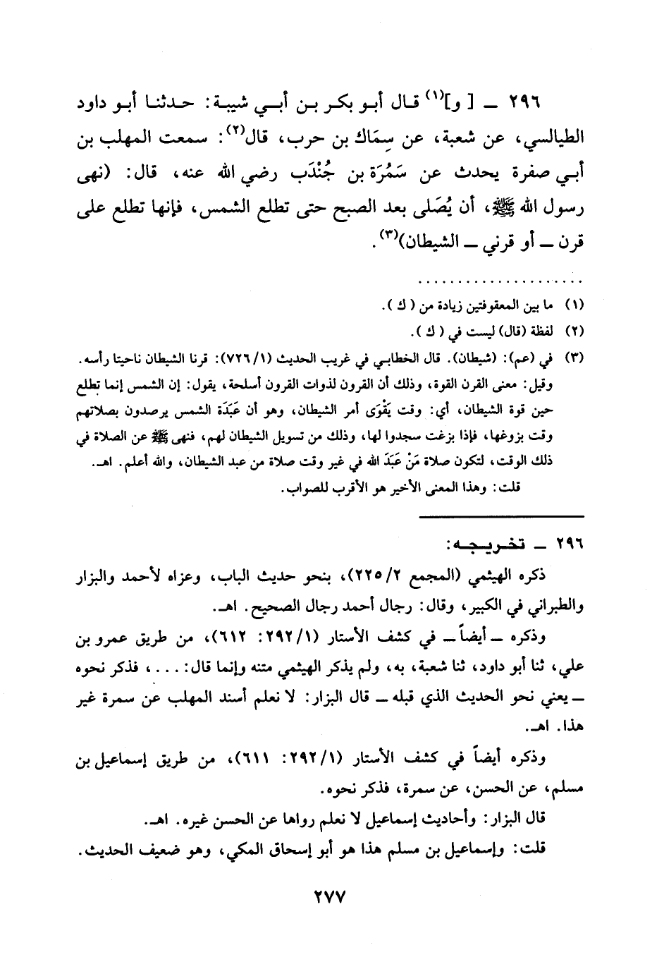 296 - وَقَالَ أَبُو بَكْرِ بْنُ أَبِي شَيْبَةَ حَدَّثَنَا أَبُو دَاوُدَ الطَّيَالِسِيُّ عَنْ شُعْبَةَ عَنْ سِمَاكِ بْنِ حَرْبٍ قَالَ سَمِعْتُ الْمُهَلَّبَ بْنَ أَبِي صُفْرَةَ يُحَدِّثُ عَنْ سَمُرَةَ بْنِ جُنْدُبٍ رَضِيَ اللَّهُ عَنْهُ قَالَ (§نَهَى رَسُولُ اللَّهِ صَلَّى اللَّهُ عَلَيْهِ وَسَلَّمَ أَنْ يُصَلَّى بَعْدَ الصُّبْحِ حَتَّى تَطْلُعَ الشَّمْسُ فَإِنَّهَا تَطْلُعُ عَلَى قَرْنٍ أَوْ قَرْنَيِ الشَّيْطَانِ)