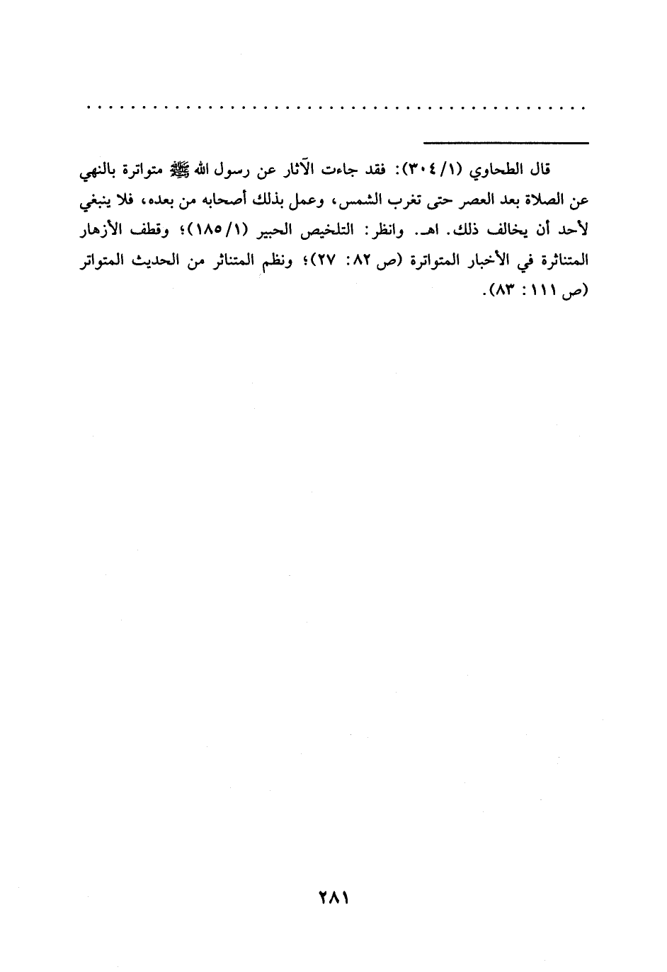 = قال الطحاوي (1/ 304): فقد جاءت الآثار عَنْ رَسُولِ اللَّهِ - صَلَّى اللَّهُ عَلَيْهِ وَسَلَّمَ - متواترة بالنهي عن الصلاة بعد العصر حتى تغرب الشمس، وعمل بذلك أصحابه من بعده، فلا ينبغي لأحد أن يخالف ذلك. اهـ. وانظر: التلخيص الحبير (1/ 185)؛ وقطف الأزهار المتناثرة في الأخبار المتواترة (ص 82: 27)؛ ونظم المتناثر من الحديث المتواتر (ص 111: 83).