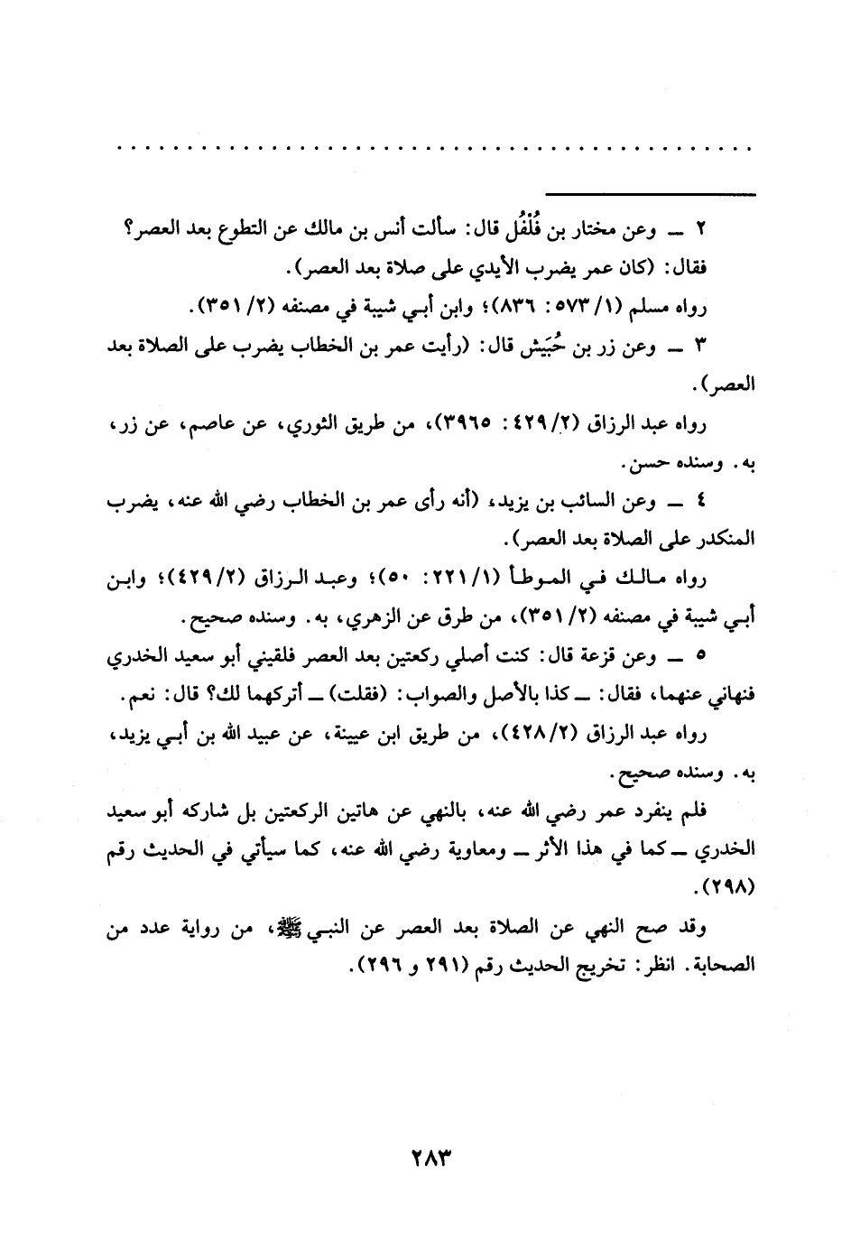 4 - وعن السائب بن يزيدد (أنه رأى عمر بن الخطاب رضي الله عنه، يضرب المنكدر على الصلاة بعد العصر).