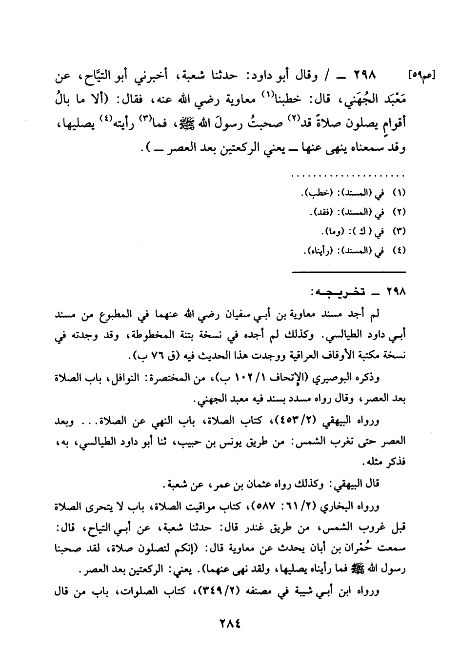 298 - وَقَالَ أَبُو دَاوُدَ حَدَّثَنَا شُعْبَةُ أَخْبَرَنِي أَبُو التَّيَّاحِ عَنْ مَعْبَدٍ الْجُهَنِيِّ قَالَ خَطَبَنَا مُعَاوِيَةُ رَضِيَ اللَّهُ عَنْهُ فَقَالَ أَلَا §مَا بَالُ أَقْوَامٍ يُصَلُّونَ صَلَاةً قَدْ صَحِبْتُ رَسُولَ اللَّهِ صَلَّى اللَّهُ عَلَيْهِ وَسَلَّمَ فَمَا رَأَيْتُهُ يُصَلِّيهَا وَقَدْ سَمِعْنَاهُ يَنْهَى عَنْهَا يَعْنِي الرَّكْعَتَيْنِ بَعْدَ الْعَصْرِ