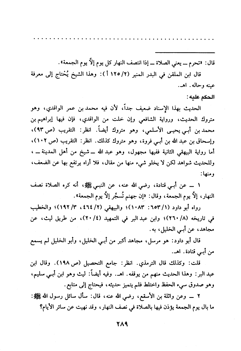 1 - عن أبي قتادة، رضي الله عنه، عَنِ النَّبِيِّ - صَلَّى اللَّهُ عَلَيْهِ وَسَلَّمَ -، أَنَّهُ كره الصَّلَاةِ نِصْفَ النَّهَارِ، إلَّا يَوْمَ الْجُمُعَةِ، وَقَالَ: "إن جهنم تُسجَّر إلَّا يوم الجمعة".