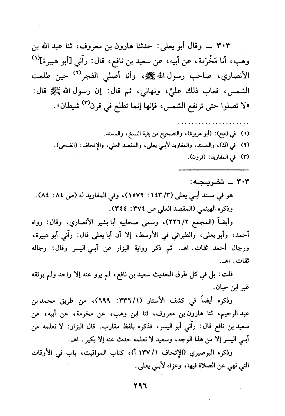 303 - وَقَالَ أَبُو يَعْلَى حَدَّثَنَا هَارُونُ بْنُ مَعْرُوفٍ ثنا عَبْدُ اللَّهِ بْنُ وَهْبٍ أنا مَخْرَمَةُ عَنْ أَبِيهِ عَنْ سَعِيدِ بْنِ نَافِعٍ قَالَ رَآنِي أَبُو هُبَيْرَةَ الْأَنْصَارِيُّ صَاحِبُ رَسُولِ اللَّهِ صَلَّى اللَّهُ عَلَيْهِ وَسَلَّمَ وَأَنَا أُصَلِّي الْفَجْرَ حِينَ طَلَعَتِ الشَّمْسُ فَعَابَ ذَلِكَ عَلَيَّ وَنَهَانِي ثُمَّ قَالَ إِنَّ رَسُولَ اللَّهِ صَلَّى اللَّهُ عَلَيْهِ وَسَلَّمَ قَالَ " §لَا تُصَلُّوا حَتَّى تَرْتَفِعَ الشَّمْسُ فَإِنَّهَا إِنَّمَا تَطْلُعُ فِي قَرْنِ شَيْطَانٍ "