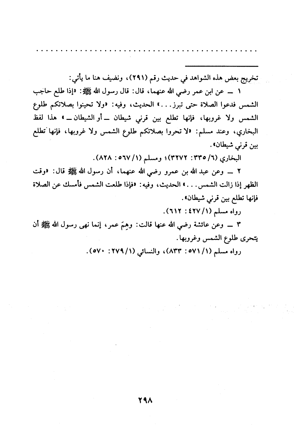 1 - عن ابن عمر رضي الله عنهما، قال: قال رسول الله عنه: "إذا طلع حاجب الشمس فدعوا الصلاة حتى تبرز ... " الحديث، وفيه: "ولا تحينوا بصلاتكم طلوع الشمس ولا غروبها، فإنها تطلع بين قرني شيطان -أوالشيطان-" هذا لفظ البخاري، وعند مسلم: "لا تحروا بصلاتكم طلوع الشمس ولا غروبها، فإنها تطلع بين قرني شيطان".