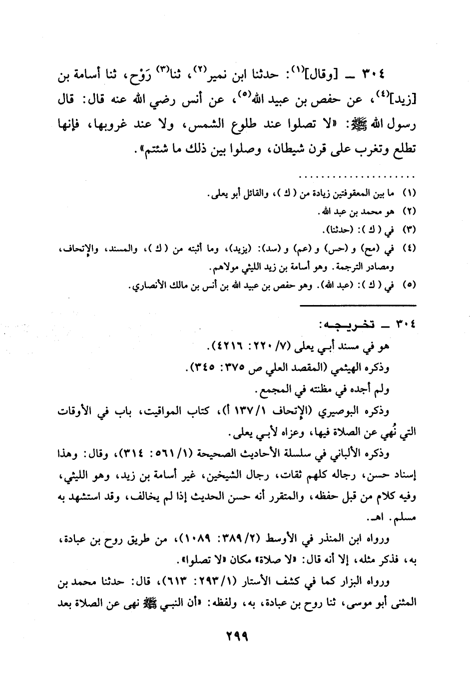 304 - وَقَالَ حَدَّثَنَا ابْنُ نُمَيْرٍ ثنا رَوْحٌ ثنا أُسَامَةُ بْنُ زَيْدٍ عَنْ حَفْصِ بْنِ عُبَيْدِ اللَّهِ عَنْ أَنَسٍ رَضِيَ اللَّهُ عَنْهُ قَالَ قَالَ رَسُولُ اللَّهِ صَلَّى اللَّهُ عَلَيْهِ وَسَلَّمَ " §لَا تُصَلُّوا عِنْدَ طُلُوعِ الشَّمْسِ وَلَا عِنْدَ غُرُوبِهَا فَإِنَّهَا تَطْلُعُ وَتَغْرُبُ عَلَى قَرْنِ شَيْطَانٍ وَصَلُّوا بَيْنَ ذَلِكَ مَا شِئْتُمْ "