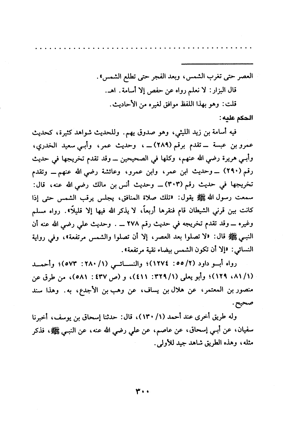 فيه أسامة بن زيد الليثي، وهو صدوق يهم. وللحديث شواهد كثيرة، كحديث عمرو بن عبسة -تقدم برقم (289) -، وحديث عمر، وأبي سعيد الخدري، وأبي هريرة رضي الله عنهم، وكلها في الصحيحين -وقد تقدم تخريجها في حديث رقم (290) - وحديث ابن عمر، وابن عمرو، وعائشة رضي الله عنهم -وتقدم تخريجها في حديث رقم (303) - وحديث أَنَسِ بْنِ مَالِكٍ رَضِيَ اللَّهُ عَنْهُ، قَالَ: سمعت رسول الله - صلى الله عليه وسلم - يقول: "تلك صلاة المنافق، يجلس يرقب الشمس حتى إذا كانت بين قرني الشيطان قام فنقرها أربعًا، لا يذكر الله فيها إلا قليلًا". رواه مسلم وغيره -وقد تقدم تخريجه في حديث رقم 278 - . وحديث علي رضي الله عنه أن النبي قال: "لا تصلوا بعد العصر، إلا أن تصلوا والشمس مرتفعة"، وفي رواية النسائي: "إلا أن تكون الشمس بيضاء نقية مرتفعة".