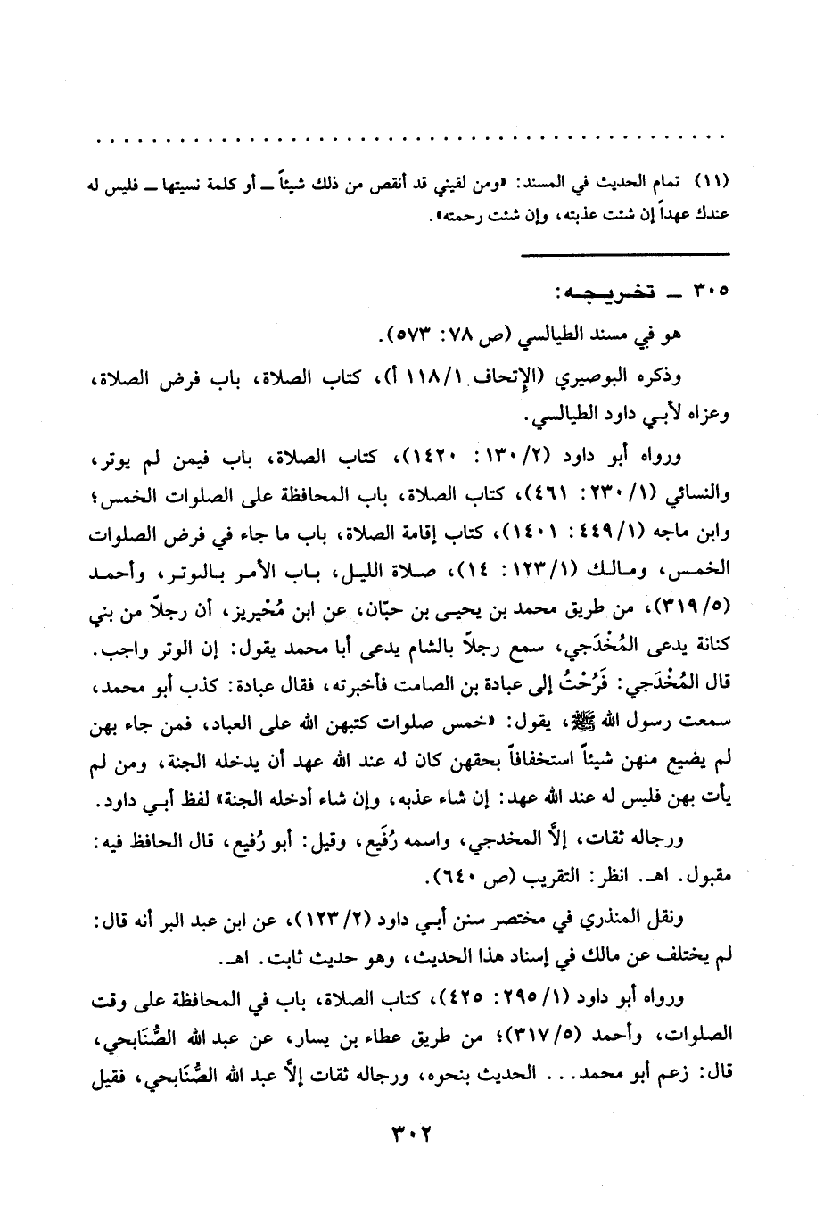 ورواه أبو داود (2/ 130: 1420)، كتاب الصلاة، باب فيمن لم يوتر، والنسائي (1/ 230: 461)، كتاب الصلاة، باب المحافظة على الصلوات الخمس؛ وابن ماجه (1/ 449: 1401)، كتاب إقامة الصلاة، باب ما جاء في فرض الصلوات الخمس، ومالك (1/ 123: 14)، صلاة الليل، باب الأمر بالوتر، وأحمد