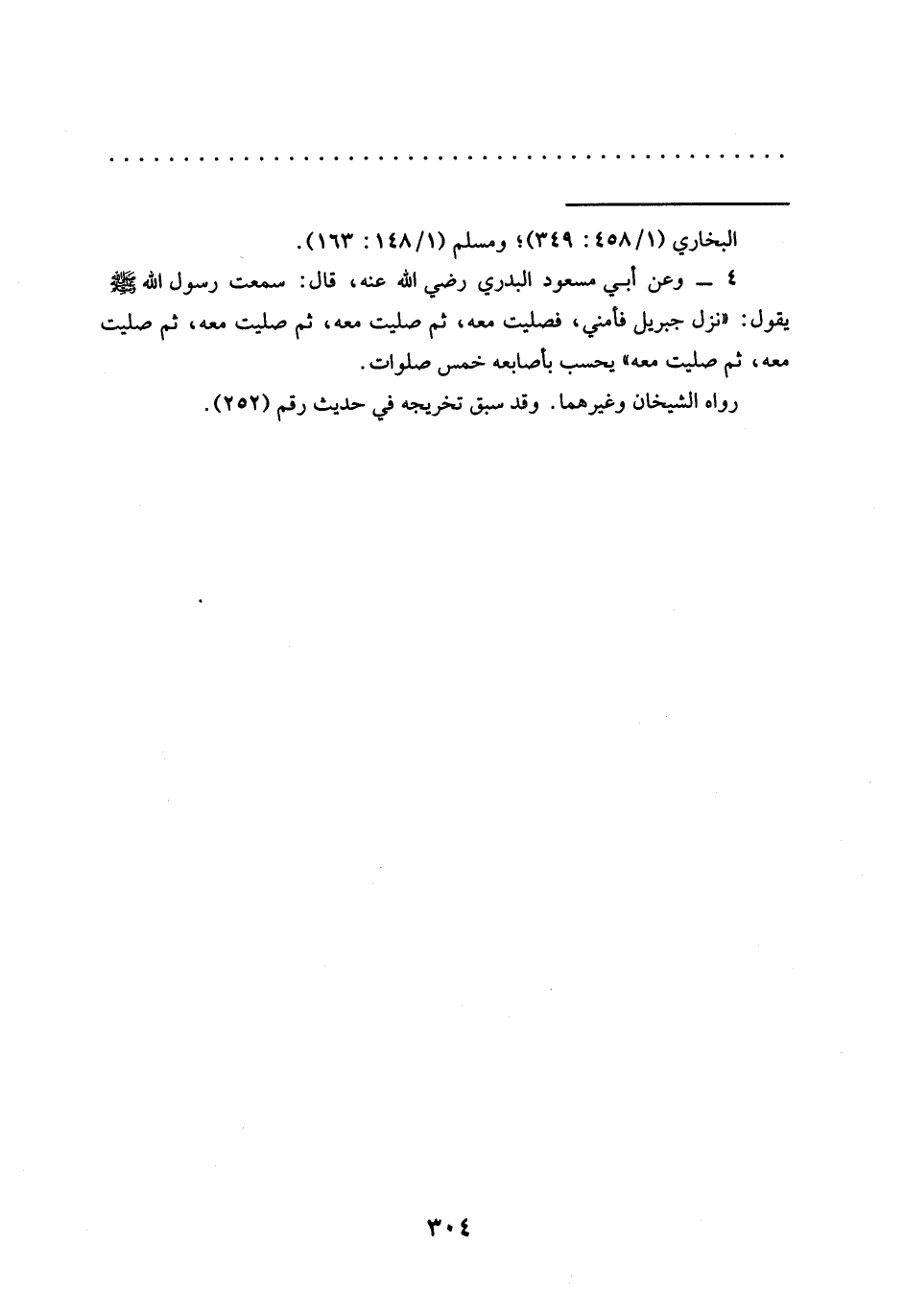 4 - وعن أبي مسعود البدري رضي الله عنه، قال: سمعت رسول الله - صلى الله عليه وسلم - يقول: "نزل جبريل فأمني، فصليت معه، ثم صليت معه، ثم صليت معه، ثم صليت معه، ثم صليت معه" يحسب بأصابعه خمس صلوات.