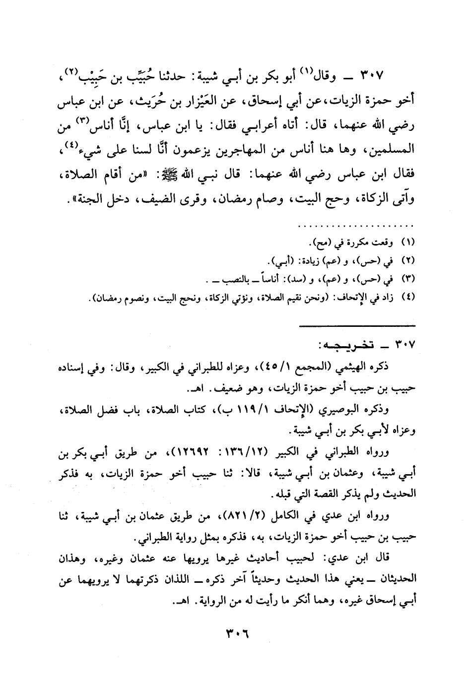 307 - وَقَالَ أَبُو بَكْرِ بْنُ أَبِي شَيْبَةَ حَدَّثَنَا حَبِيبُ بْنُ حَبِيبٍ أَخُو حَمْزَةَ الزَّيَّاتِ عَنْ أَبِي إِسْحَاقَ عَنِ الْعَيْزَارِ بْنِ حُرَيْثٍ عَنِ ابْنِ عَبَّاسٍ رَضِيَ اللَّهُ عَنْهُما قَالَ أَتَاهُ أَعْرَابِيٌّ فَقَالَ يَا ابْنَ عَبَّاسٍ إِنَّا أُنَاسٌ من المسلمين وها هنا أُنَاسٌ مِنَ الْمُهَاجِرِينِ يَزْعُمُونَ أَنَّا لَسْنَا عَلَى شَيْءٍ فَقَالَ ابْنُ عَبَّاسٍ رَضِيَ اللَّهُ عَنْهُما قَالَ نَبِيُّ اللَّهِ صَلَّى اللَّهُ عَلَيْهِ وَسَلَّمَ " §مَنْ أَقَامَ الصَّلَاةَ وَأَتَى الزَّكَاةَ وَحَجَّ الْبَيْتَ وَصَامَ رَمَضَانَ وَقَرَى الضَّيْفَ دَخَلَ الْجَنَّةَ "