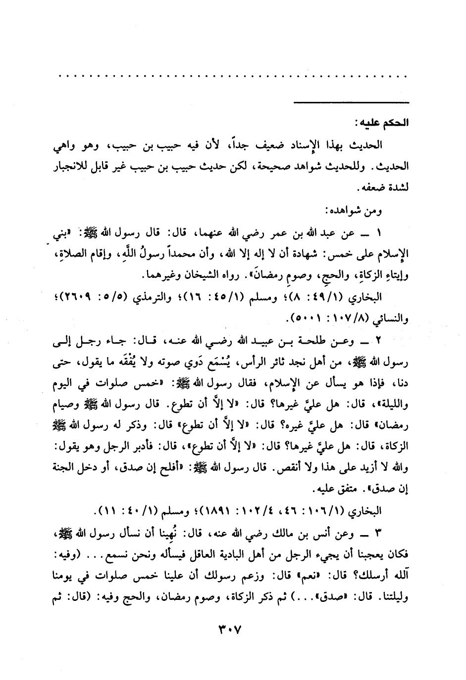 البخاري (1/ 49: 8)؛ ومسلم (1/ 45: 16)؛ والترمذي (5/ 5: 2609)؛ والنسائي (8/ 107: 5001).