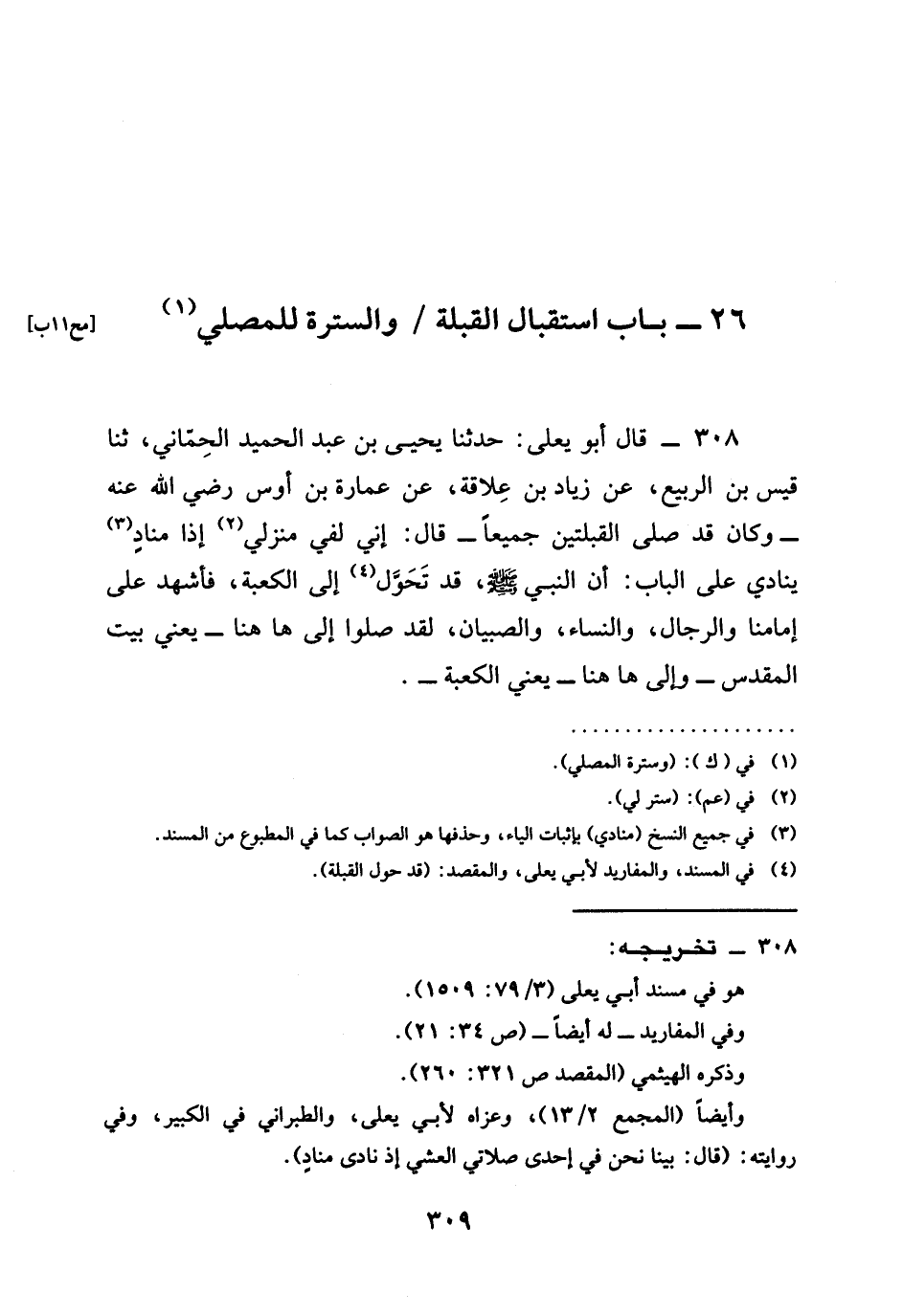 308 - قَالَ أَبُو يَعْلَى حَدَّثَنَا يَحْيَى بْنُ عَبْدِ الْحَمِيدِ الْحِمَّانِيُّ ثنا قَيْسُ بْنُ الرَّبِيعِ عَنْ زِيَادِ بْنِ عِلَاقَةَ عَنْ عُمَارَةَ بْنِ أَوْسٍ رَضِيَ اللَّهُ عَنْهُ وَكَانَ قَدْ صَلَّى الْقِبْلَتَيْنِ جَمِيعًا قَالَ إِنِّي لَفِي مَنْزِلِي إِذَا مُنَادٍ يُنَادِي عَلَى الْبَابِ أَنَّ النَّبِيَّ صَلَّى اللَّهُ عَلَيْهِ وَسَلَّمَ §قَدْ تَحَوَّلَ إِلَى الْكَعْبَةِ فَأَشْهَدُ عَلَى إِمَامِنَا وَالرِّجَالِ وَالنِّسَاءِ وَالصِّبْيَانِ لَقَدْ صلوا إلى ها هنا يَعْنِي بَيْتَ المقدس وإلى ها هنا يَعْنِي الْكَعْبَةَ