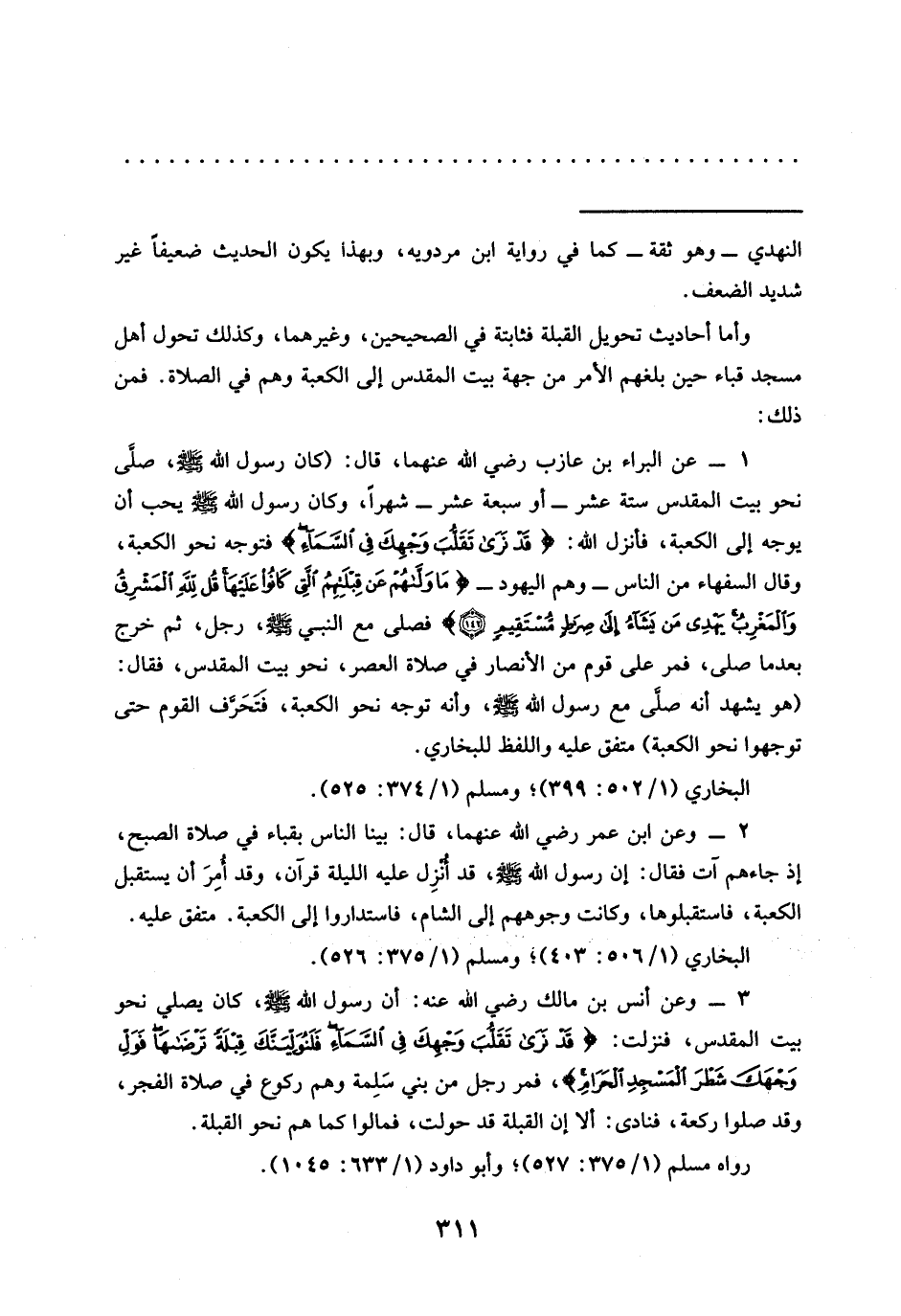 1 - عن البراء بن عازب رَضِيَ اللَّهُ عَنْهُمَا، قَالَ: (كَانَ رَسُولُ اللَّهِ - صَلَّى اللَّهُ عَلَيْهِ وسلم -، صلَّى نحو بيت المقدس ستة عشر -أو سبعة عشر- شهرًا، وَكَانَ رَسُولُ اللَّهِ - صَلَّى اللَّهُ عَلَيْهِ وَسَلَّمَ - يحب أن يوجه إلى الكعبة، فأنزل الله: {قَدْ نَرَى تَقَلُّبَ وَجْهِكَ فِي السَّمَاءِ} فتوجه نحو الكعبة، وقال السفهاء من الناس -وهم اليهود- {مَا وَلَّاهُمْ عَنْ قِبْلَتِهِمُ الَّتِي كَانُوا عَلَيْهَا قُلْ لِلَّهِ الْمَشْرِقُ وَالْمَغْرِبُ يَهْدِي مَنْ يَشَاءُ إِلَى صِرَاطٍ مُسْتَقِيمٍ (142)} فصلى مع النبي - صلى الله عليه وسلم -، رجل، ثم خرج بعدما صلى، فمر على قوم من الأنصار في صلاة العصر، نحو بيت المقدس، فقال: (هو يشهد أنه صلَّى مَعَ رَسُولِ اللَّهِ - صَلَّى اللَّهُ عَلَيْهِ وَسَلَّمَ -، وأنه توجه نحو الكعبة، فتحَرف القوم حتى توجهوا نحو الكعبة) متفق عليه واللفظ للبخاري.