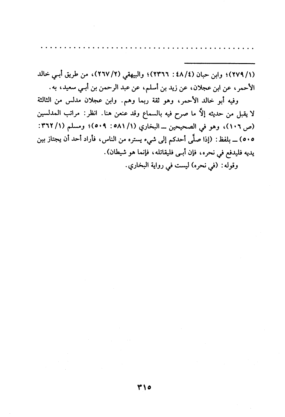 وفيه أبو خالد الأحمر، وهو ثقة ربما وهم. وابن عجلان مدلس من الثالثة لا يقبل من حديثه إلَّا ما صرح فيه بالسماع وقد عنعن هنا. انظر: مراتب المدلسين (ص 106)، وهو في الصحيحين -البخاري (1/ 581: 509)؛ ومسلم (1/ 362: 505) - بلفظ: (إذا صلَّى أحدكم إلى شيء يستره من الناس، فأراد أحد أن يجتاز بين يديه فليدفع في نحوه، فإن أبى فليقاتله، فإنما هو شيطان).