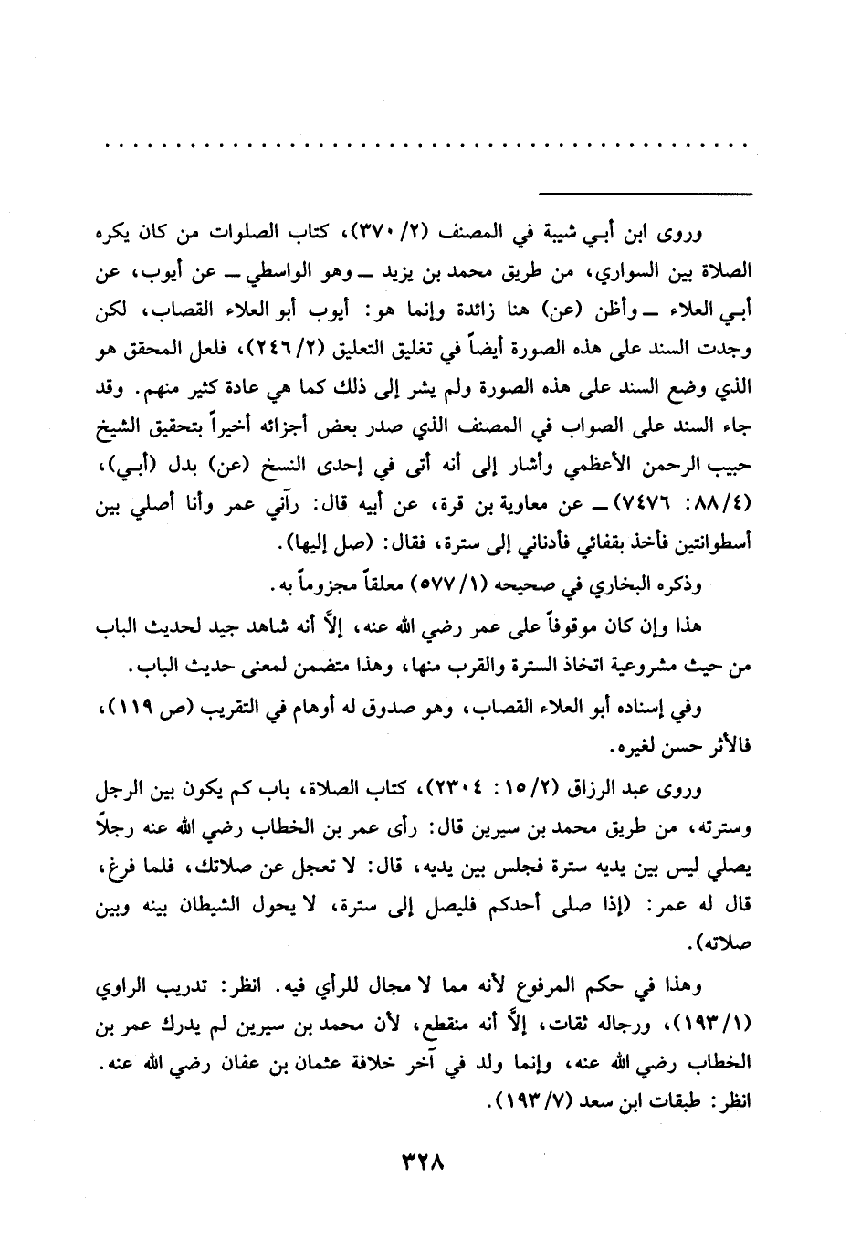 وروى عبد الرزاق (2/ 15: 2304)، كتاب الصلاة، باب كم يكون بين الرجل وسترتة، من طريق محمد بن سيرين قال: رأى عمر بن الخطاب رضي الله عنه رجلًا يصلي ليس بين يديه سترة فجلس بين يديه، قال: لا تعجل عن صلاتك، فلما فرغ، قال له عمر: (إذا صلى أحدكم فليصل إلى سترة، لا يحول الشيطان بينه وبين صلاته).