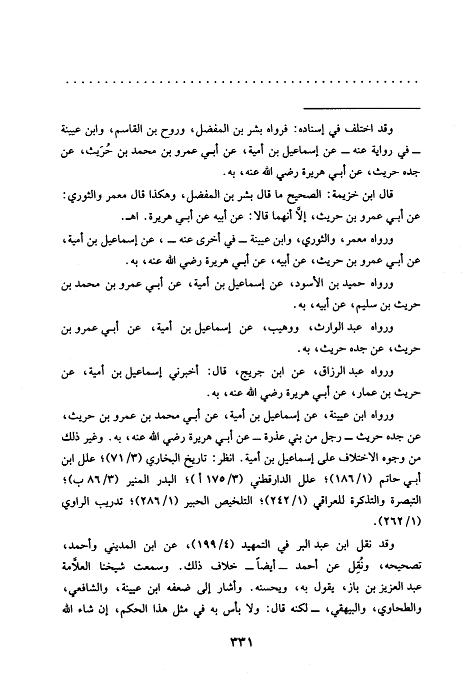 ورواه ابن عيينة، عن إسماعيل بن أمية، عن أبي محمد بن عمرو بن حريث، عن جده حريث -رجل من بني عذرة- عن أبي هريرة رضي الله عنه، به. وغير ذلك من وجوه الاختلاف على إسماعيل بن أمية. انظر: تاريخ البخاري (3/ 71)؛ علل ابن أبي حاتم (1/ 186)؛ علل الدارقطني (3/ 175 أ)؛ البدر المنير (3/ 86 ب)؛ التبصرة والتذكرة للعراقي (1/ 242)؛ التلخيص الحبير (1/ 286)؛ تدريب الراوي (1/ 262).