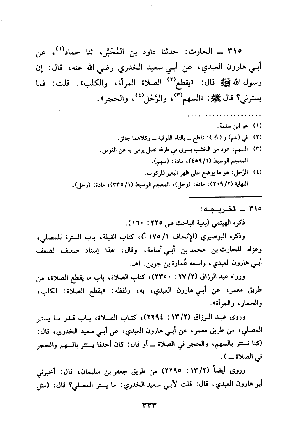 315 - الْحَارِثُ حَدَّثَنَا دَاوُدُ بْنُ الْمُحَبَّرِ ثنا حَمَّادٌ عَنْ أَبِي هَارُونَ الْعَبْدِيِّ عَنْ أَبِي سعيد الخدري رضي الله عنه قال أَنَّ رَسُولَ اللَّهِ صَلَّى اللَّهُ عَلَيْهِ وَسَلَّمَ قَالَ " §يَقْطَعُ الصَّلَاةَ الْمَرْأَةُ وَالْكَلْبُ " قُلْتُ فَمَا يَسْتُرُنِي قَالَ صَلَّى اللَّهُ عَلَيْهِ وَسَلَّمَ " السَّهْمُ وَالرَّحْلُ وَالْحَجَرُ "
