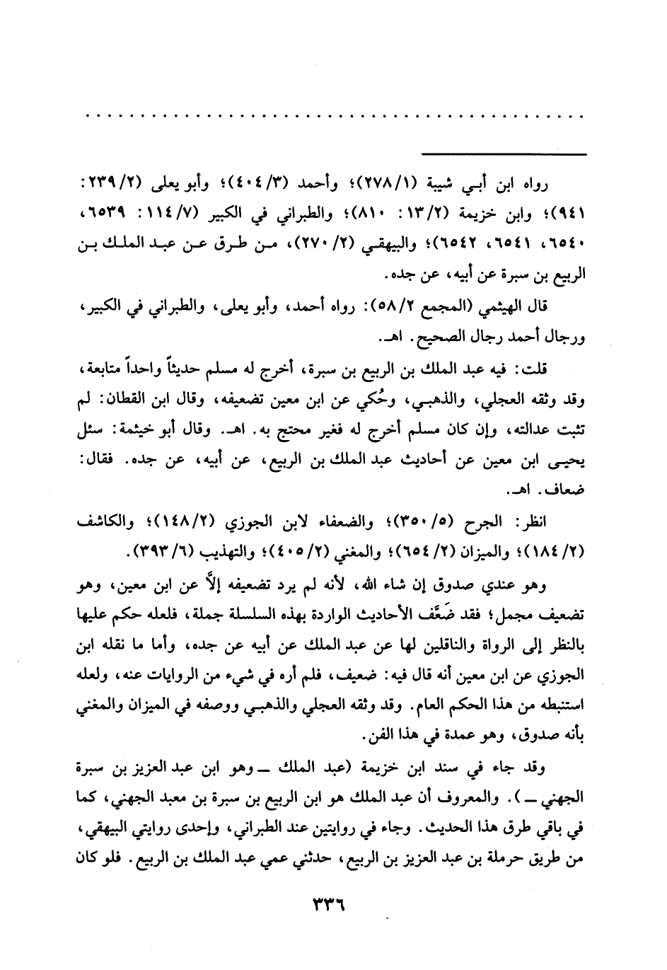 = رواه ابن أبي شيبة (1/ 278)؛ وأحمد (3/ 404)؛ وأبو يعلى (2/ 239: 941)؛ وابن خزيمة (2/ 13: 810)؛ والطبراني في الكبير (7/ 114: 6539، 6540، 6541، 6542)؛ والبيهقي (2/ 270)، من طرق عن عبد الملك بن الربيع بن سبرة عن أبيه، عن جده.