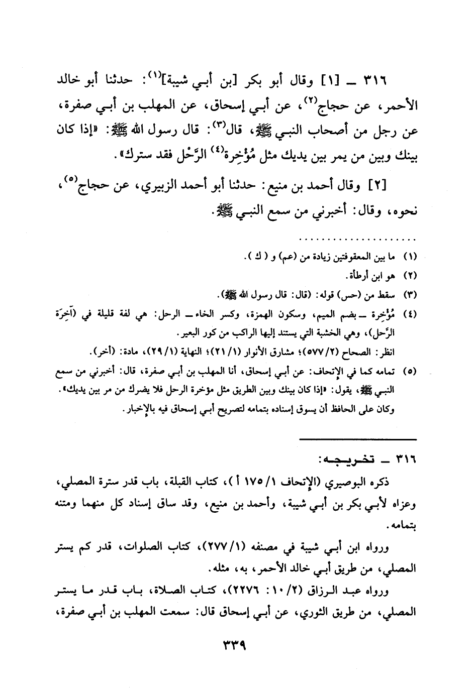 316 -[1] وَقَالَ أَبُو بَكْرِ بْنُ أَبِي شَيْبَةَ حَدَّثَنَا أَبُو خَالِدٍ الْأَحْمَرُ عَنْ حَجَّاجٍ عَنْ أَبِي إِسْحَاقَ عَنِ الْمُهَلَّبِ بْنِ أَبِي صُفْرَةَ عَنْ رَجُلٍ مِنْ أَصْحَابِ النَّبِيِّ صَلَّى اللَّهُ عَلَيْهِ وَسَلَّمَ قَالَ قَالَ رَسُولُ اللَّهِ صَلَّى اللَّهُ عَلَيْهِ وَسَلَّمَ " §إِذَا كَانَ بَيْنَكَ وَبَيْنَ مَنْ يَمُرُّ بَيْنَ يَدَيْكَ مِثْلُ مُؤْخِرَةِ الرَّحْلِ فَقَدْ سَتَرَكَ