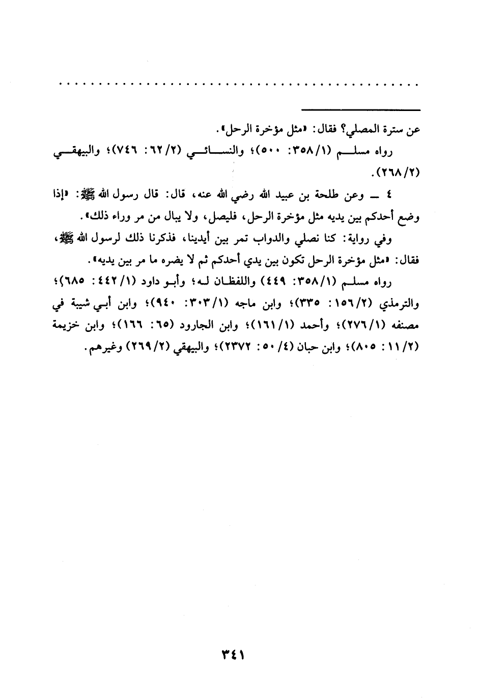 4 - وعن طلحة بن عبيد الله رَضِيَ اللَّهُ عَنْهُ، قَالَ: قَالَ رَسُولُ اللَّهِ - صلى الله عليه وسلم -: "إذا وضع أحدكم بين يديه مثل مؤخرة الرحل، فليصل، ولا يبال من مر وراء ذلك".