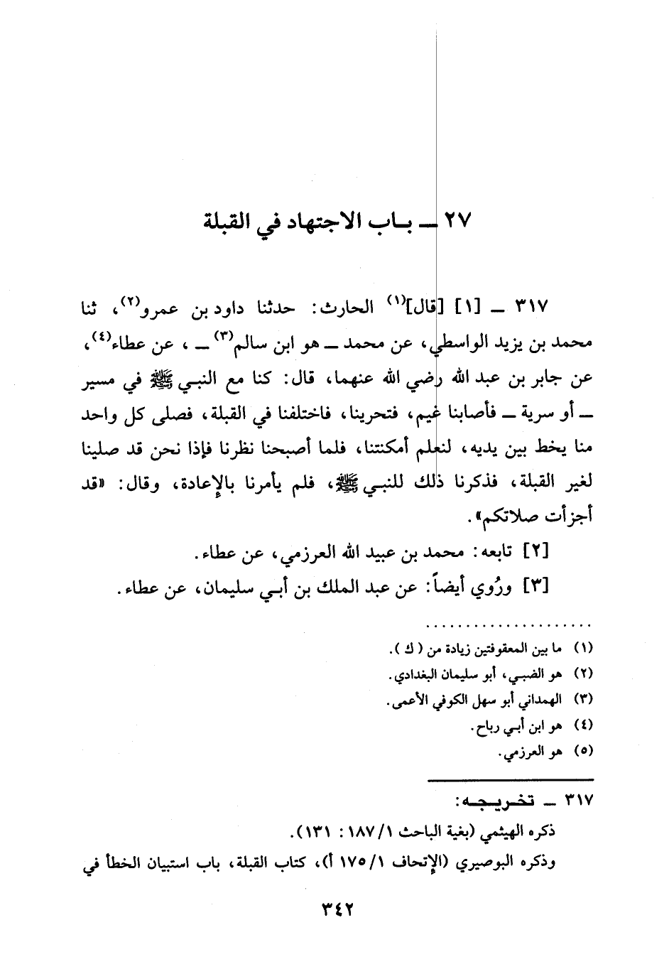 317 -[1] قَالَ الْحَارِثُ حَدَّثَنَا دَاوُدُ بْنُ عَمْرٍو ثنا مُحَمَّدُ بْنُ يَزِيدَ الْوَاسِطِيُّ عَنْ مُحَمَّدٍ هُوَ ابْنُ سَالِمٍ عَنْ عَطَاءٍ عَنْ جَابِرِ بْنِ عَبْدِ اللَّهِ رَضِيَ اللَّهُ عَنْهُما قَالَ كُنَّا مَعَ النَّبِيِّ صَلَّى اللَّهُ عَلَيْهِ وَسَلَّمَ فِي مَسِيرٍ أَوْ سَرِيَّةٍ فَأَصَابَنَا غَيْمٌ §فَتَحَرَّيْنَا فَاخْتَلَفْنَا فِي الْقِبْلَةِ فَصَلَّى كُلُّ وَاحِدٍ مِنَّا يَخُطُّ بَيْنَ يَدَيْهِ لِنَعْلَمَ أَمْكِنَتَنَا فَلَمَّا أَصْبَحْنَا نَظَرْنَا فَإِذَا نَحْنُ قَدْ صَلَّيْنَا لِغَيْرِ الْقِبْلَةِ فَذَكَرْنَا ذَلِكَ لِلنَّبِيِّ صَلَّى اللَّهُ عَلَيْهِ وَسَلَّمَ فَلَمْ يَأْمُرْنَا بِالْإِعَادَةِ وَقَالَ " قَدْ أَجْزَأَتْ صَلَاتُكُمْ "