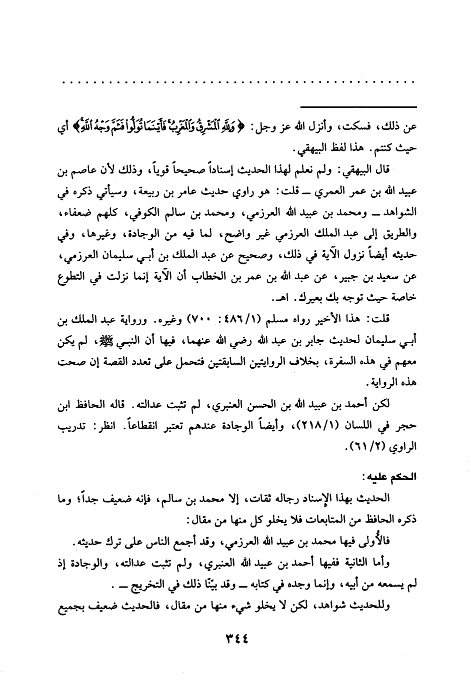 قال البيهقي: ولم نعلم لهذا الحديث إسنادًا صحيحًا قويًا، وذلك لأن عاصم بن عبيد الله بن عمر العمري -قلت: هو راوي حديث عامر بن ربيعة، وسيأتي ذكره في الشواهد- ومحمد بن عبيد الله العرزمي، ومحمد بن سالم الكوفي، كلهم ضعفاء، والطريق إلى عبد الملك العرزمي غير واضح، لما فيه من الوجادة، وغيرها، وفي حديثه أيضًا نزول الآية في ذلك، وصحيح عن عبد الملك بن أبي سليمان العرزمي، عن سعيد بن جبير، عَنْ عَبْدِ اللَّهِ بْنِ عُمَرَ بْنِ الْخَطَّابِ أن الآية إنما نزلت في التطوع خاصة حيث توجه بك بعيرك. اهـ.