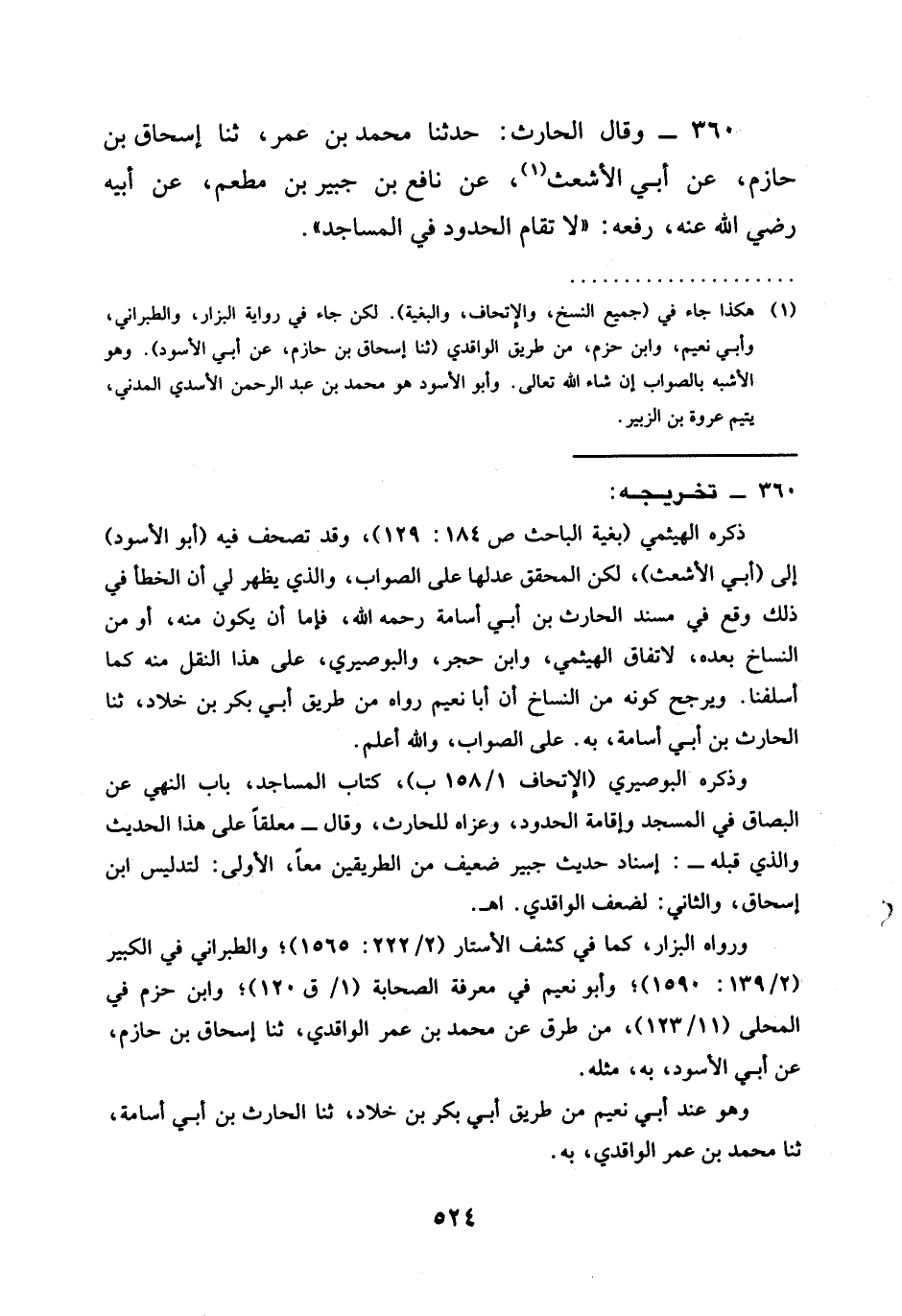 360 - وَقَالَ الْحَارِثُ حَدَّثَنَا مُحَمَّدُ بْنُ عُمَرَ ثنا إِسْحَاقُ بْنُ حَازِمٍ عَنْ أَبِي الْأَشْعَثِ عَنْ نَافِعِ بْنِ جُبَيْرِ بْنِ مُطْعِمٍ عَنْ أَبِيهِ رَضِيَ اللَّهُ عَنْهُ رَفَعَهُ " §لَا تُقَامُ الْحُدُودُ فِي الْمَسَاجِدِ "