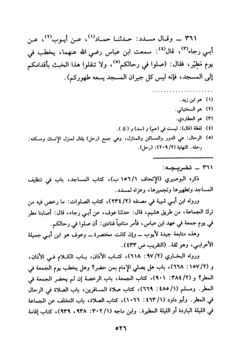 361 - وَقَالَ مُسَدَّدٌ حَدَّثَنَا حَمَّادٌ عَنْ أَيُّوبَ عَنْ أَبِي رَجَاءٍ قَالَ سَمِعْتُ ابْنَ عَبَّاسٍ رَضِيَ اللَّهُ عَنْهُما يَخْطُبُ فِي يَوْمٍ مَطِيرٍ فَقَالَ (§صَلُّوا فِي رِحَالِكُمْ وَلَا تَنْقِلُوا هَذَا الْخَبَثَ بِأَقْدَامِكُمْ إِلَى الْمَسْجِدِ فَإِنَّهُ لَيْسَ كُلُّ جِيرَانِ الْمَسْجِدِ يَسَعُهُ طُهُورُكُمْ)