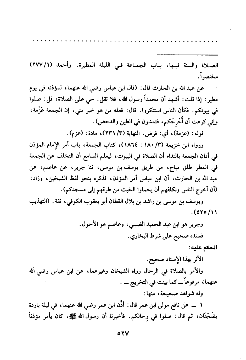 والأمر بالصلاة في الرحال رواه الشيخان وغيرهما، عن ابن عباس رضي الله عنهما، مرفوعًا -كما بينت في التخريج-.
