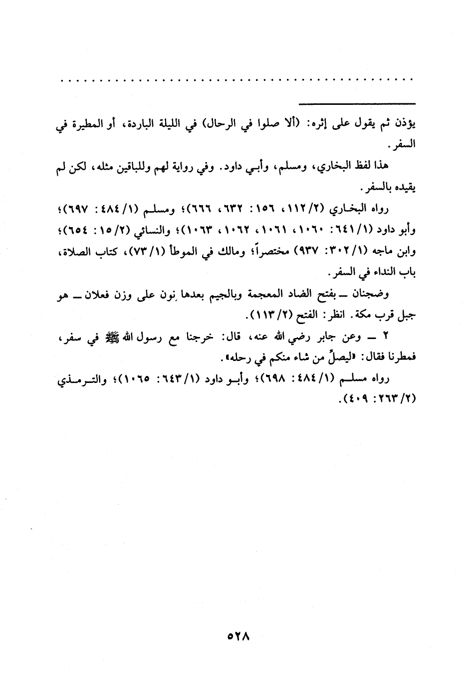 رواه البخاري (2/ 112، 156: 632، 666)؟ ومسلم (1/ 484: 697)؛ وأبو داود (1/ 641: 1060، 1061، 1062، 1063)، والنسائي (2/ 15: 654)؛ وابن ماجه (1/ 302: 937) مختصرًا؛ ومالك في الموطأ (1/ 73)، كتاب الصلاة، باب النداء في لسفر وضجنان -بفتح الضاد المعجمة وبالجيم بعدها نون على وزن فعلان- هو جبل قرب مكة. انظر: الفتح (2/ 113).