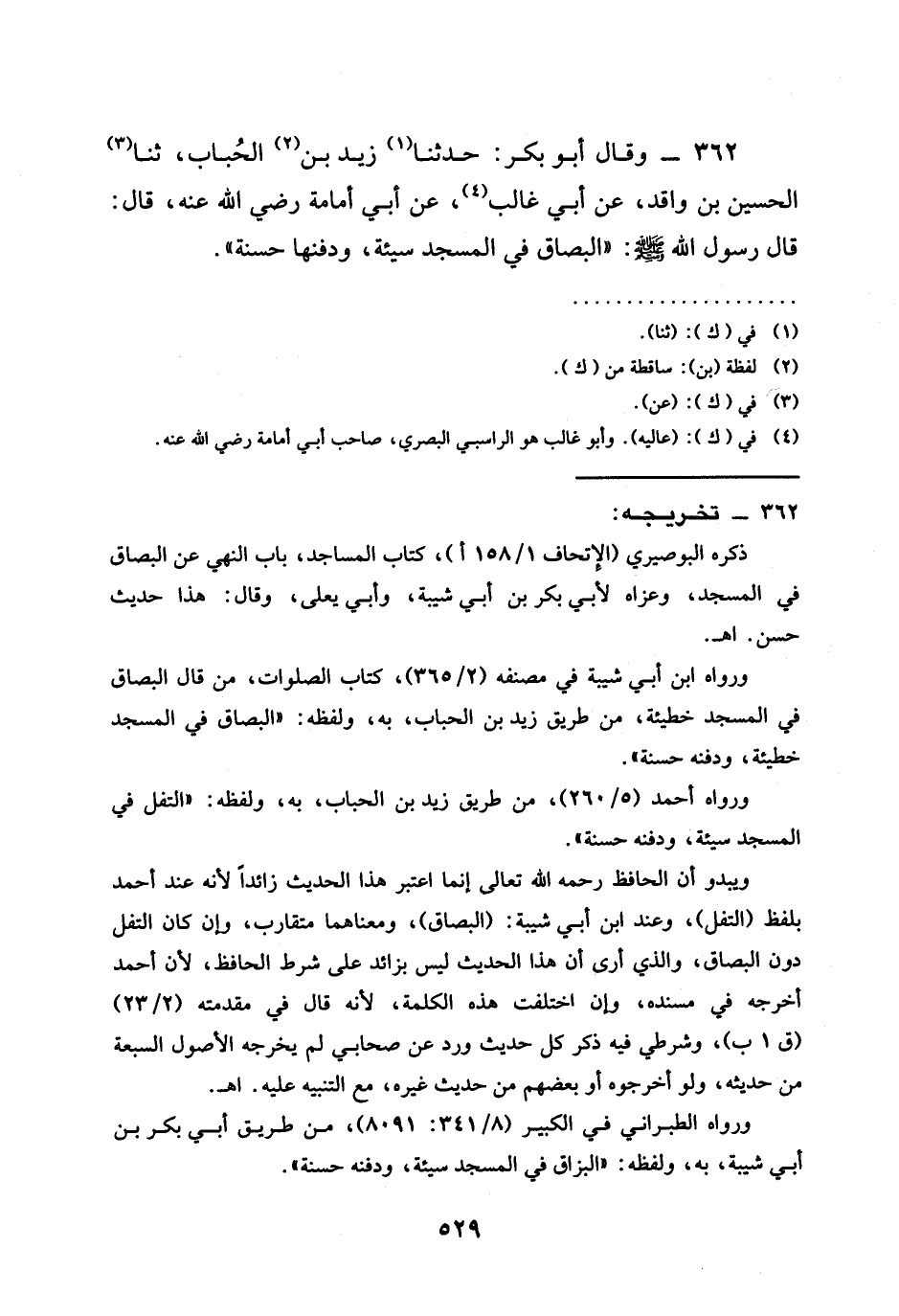 362 - وَقَالَ أَبُو بَكْرٍ حَدَّثَنَا زَيْدُ بْنُ الْحُبَابِ ثنا الْحُسَيْنُ بْنُ وَاقِدٍ عَنْ أَبِي غَالِبٍ عَنْ أَبِي أُمَامَةَ رَضِيَ اللَّهُ عَنْهُ قَالَ قَالَ رَسُولُ اللَّهِ صَلَّى اللَّهُ عَلَيْهِ وَسَلَّمَ " §الْبُصَاقُ فِي الْمَسْجِدِ سَيِّئَةٌ وَدَفْنُهَا حَسَنَةٌ "