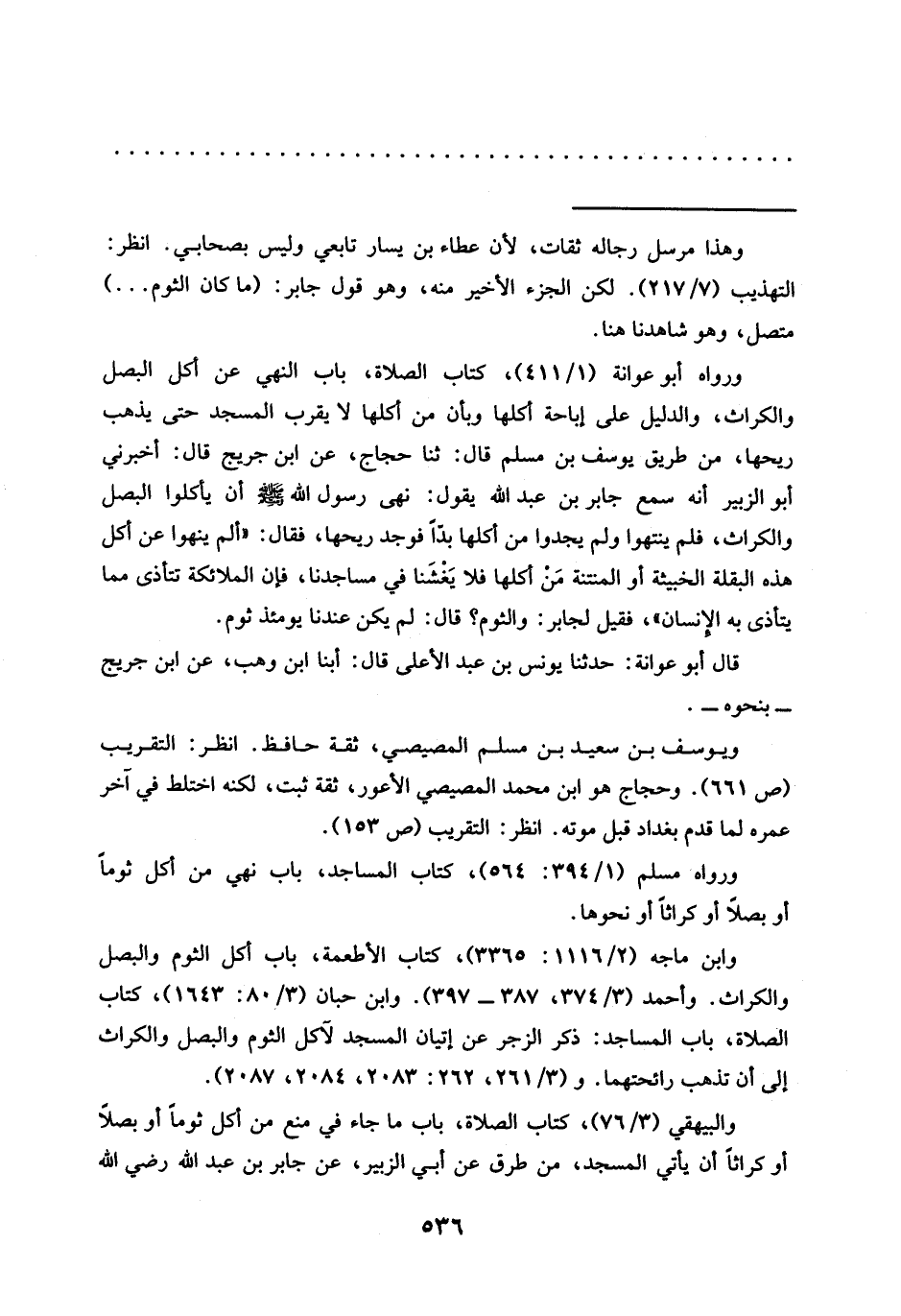 وابن ماجه (2/ 1116: 3365)، كتاب الأطعمة، باب أكل الثوم والبصل والكراث. وأحمد (3/ 374، 387 - 397). وابن حبان (3/ 80: 1643)، كتاب الصلاة، باب المساجد: ذكر الزجر عن إتيان المسجد لآكل الثوم والبصل والكراث إلى أن تذهب رائحتهما. و (3/ 261، 262: 2083، 2084، 2087).