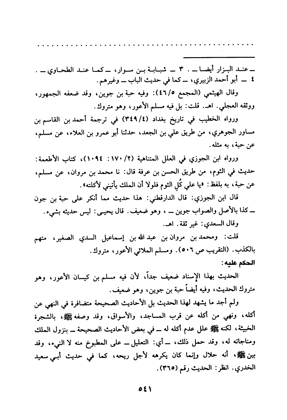 قال ابن الجوزي: قال الدارقطني: هذا حديث مما أنكر على حبة بن جون -كذا بالأصل والصواب جوين-، وهو ضعيف. قال يحيى: ليس حديثه بشيء.