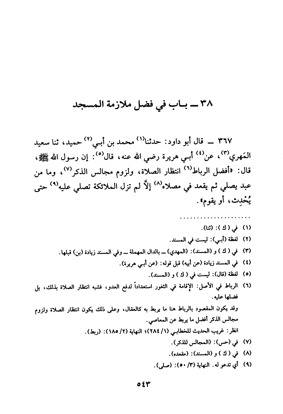 367 - قَالَ أَبُو دَاوُدَ حَدَّثَنَا مُحَمَّدُ بْنُ أَبِي حُمَيْدٍ ثنا سَعِيدٌ الْمَهْرِيُّ عَنْ أَبِي هُرَيْرَةَ رَضِيَ اللَّهُ عَنْهُ قال إنَّ رَسُولَ اللَّهِ صَلَّى اللَّهُ عَلَيْهِ وَسَلَّمَ قَالَ " §أَفْضَلُ الرِّبَاطِ انْتِظَارُ الصَّلَاةِ وَلُزُومُ مَجَالِسِ الذِّكْرِ وَمَا مِنْ عَبْدٍ يُصَلِّي ثُمَّ يَقْعُدُ فِي مُصَلَّاهُ إِلَّا لَمْ تَزَلِ الْمَلَائِكَةُ تُصَلِّي عَلَيْهِ حَتَّى يُحْدِثَ أَوْ يَقُومَ "