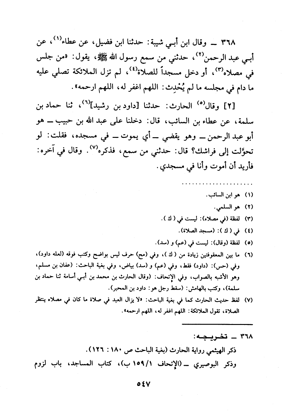 [2] وَقَالَ الْحَارِثُ حَدَّثَنَا دَاوُدُ بْنُ رُشَيْدٍ ثنا حَمَّادُ بْنُ سَلَمَةَ عَنْ عَطَاءِ بْنِ السَّائِبِ قَالَ دَخَلْنَا عَلَى عَبْدِ اللَّهِ بْنِ حَبِيبٍ هُوَ أَبُو عَبْدِ الرَّحْمَنِ وَهُوَ يَقْضِي أَيْ يَمُوتُ فِي مَسْجِدِهِ فَقُلْتُ لَوْ تَحَوَّلْتَ إِلَى فِرَاشِكَ قَالَ حَدَّثَنِي مَنْ سَمِعَ فَذَكَرَهُ وَقَالَ فِي آخِرِهِ فَأُرِيدُ أَنْ أَمُوتَ وَأَنَا فِي مَسْجِدِي