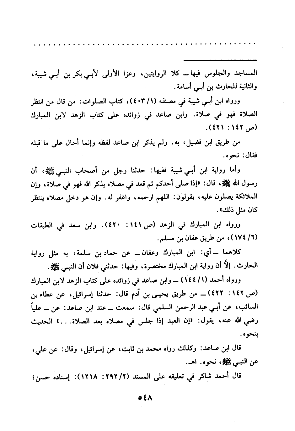 = المساجد والجلوس فيها- كلا الروايتين، وعزا الأولى لأبي بكر بن أبي شيبة، والثانية للحارث بن أبي أسامة.