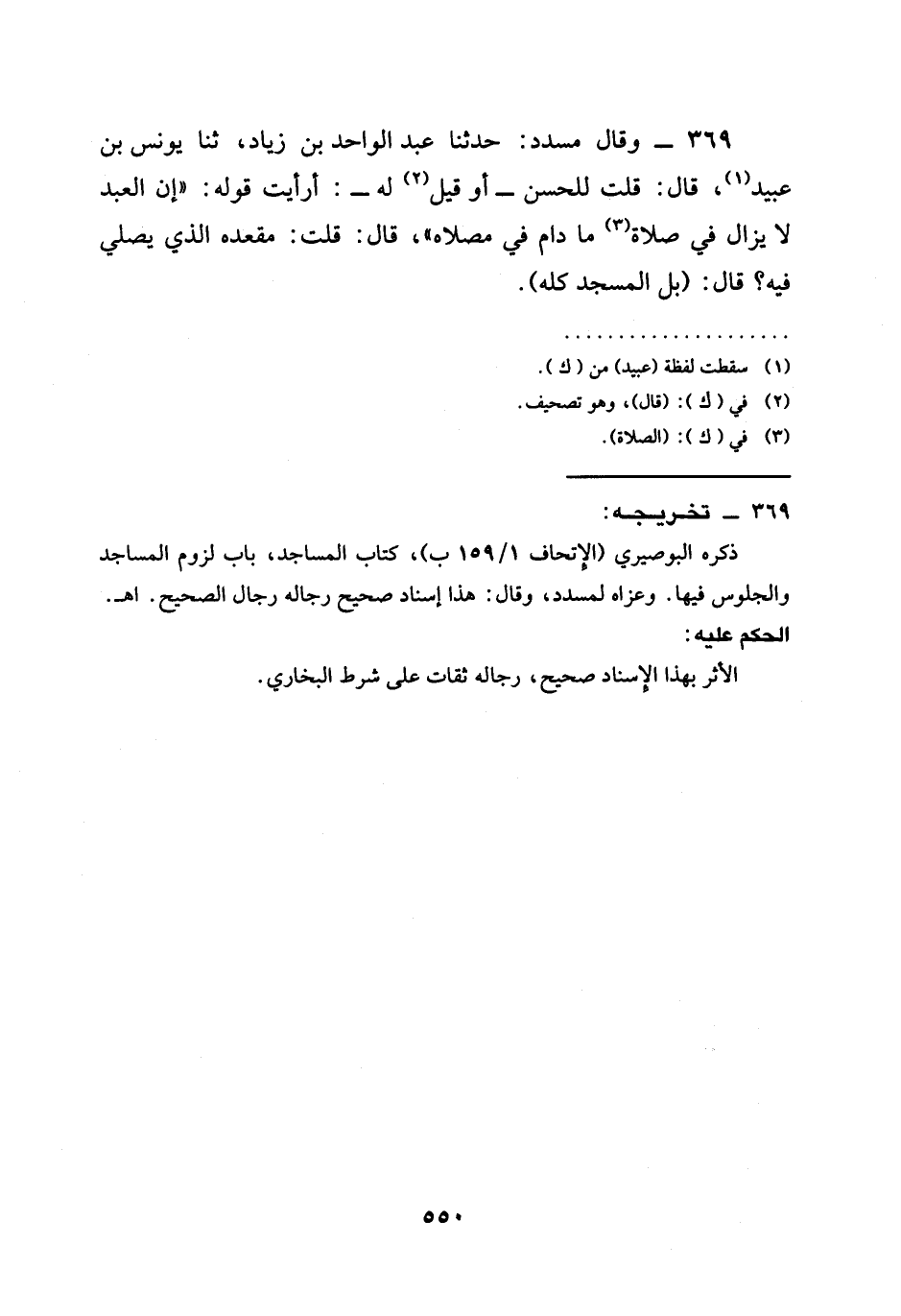 369 - وَقَالَ مُسَدَّدٌ حَدَّثَنَا عَبْدُ الْوَاحِدِ بْنُ زِيَادٍ ثنا يُونُسُ بْنُ عُبَيْدٍ قَالَ قُلْتُ لِلْحَسَنِ أَوْ قِيلَ لَهُ أَرَأَيْتَ قَوْلَهُ " إِنَّ §الْعَبْدَ لَا يَزَالُ فِي صَلَاةٍ مَا دَامَ فِي مُصَلَّاهُ " قَالَ قُلْتُ مَقْعَدُهُ الَّذِي يُصَلِّي فِيهِ قَالَ (بَلِ الْمَسْجِدُ كُلُّهُ)