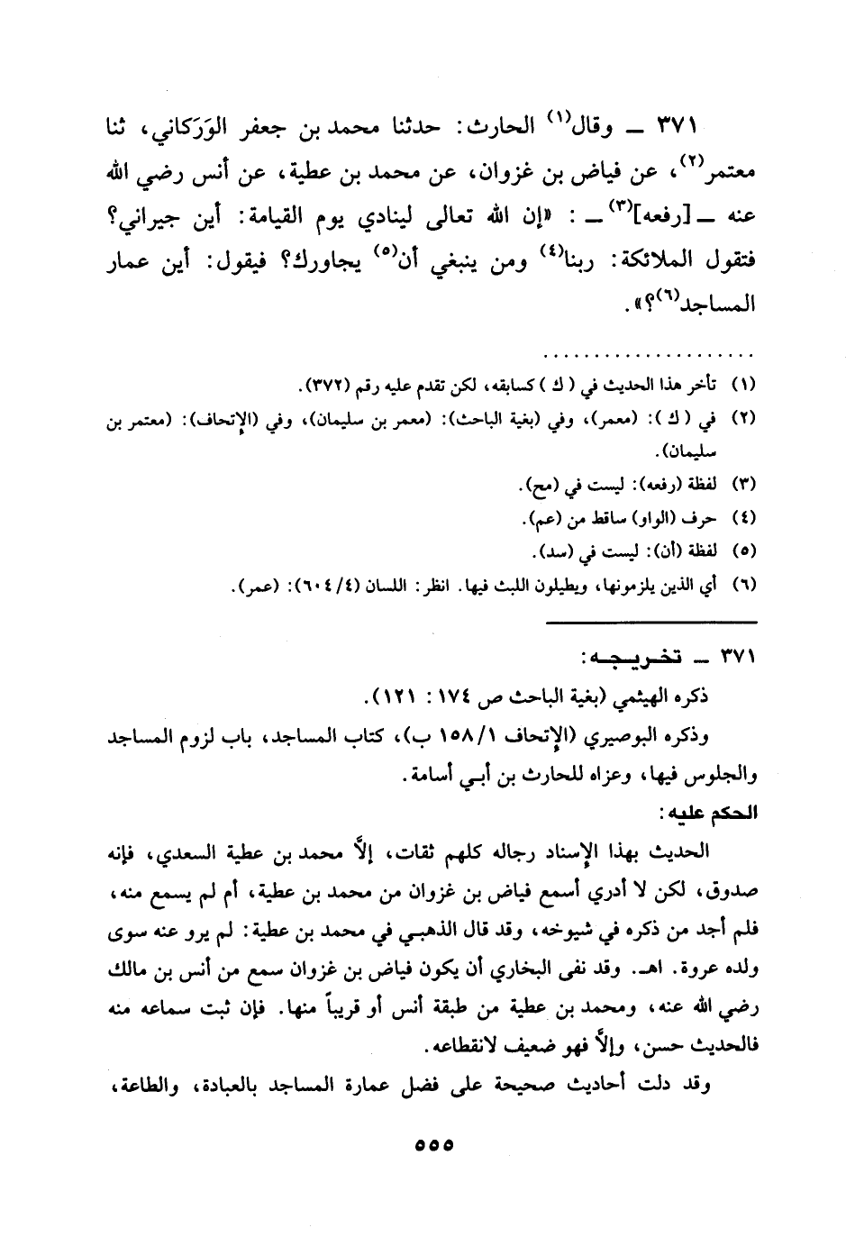 371 - وَقَالَ الْحَارِثُ حَدَّثَنَا مُحَمَّدُ بْنُ جَعْفَرٍ الْوَرَكَانِيُّ ثنا معتمر عَنْ فَيَّاضِ بْنِ عزوان عَنْ مُحَمَّدِ بْنِ عَطِيَّةَ عَنْ أَنَسٍ رَضِيَ اللَّهُ عَنْهُ - رَفَعَهُ - " إِنَّ اللَّهَ تَعَالَى لَيُنَادِي يَوْمَ الْقِيَامَةِ §أَيْنَ جِيرَانِي فَتَقُولُ الْمَلَائِكَةُ رَبَّنَا وَمَنْ يَنْبَغِي أَنْ يُجَاوِرَكَ فَيَقُولُ أَيْنَ عُمَّارُ الْمَسَاجِدِ